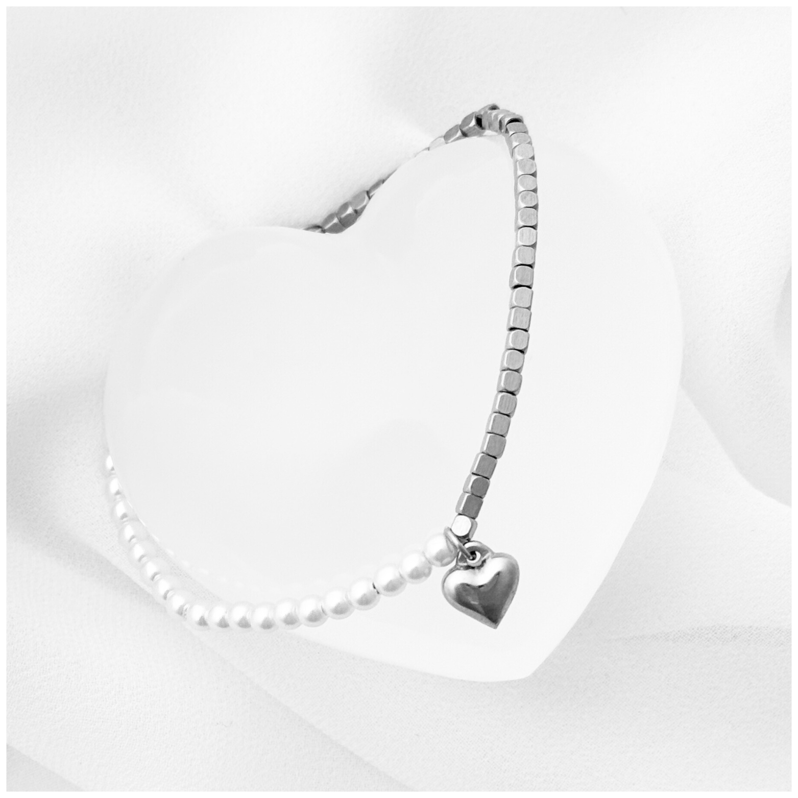 PULSERA CON CORAZON MITAD PERLAS Y MITAD CUBOS EN ACERO INOXIDABLE