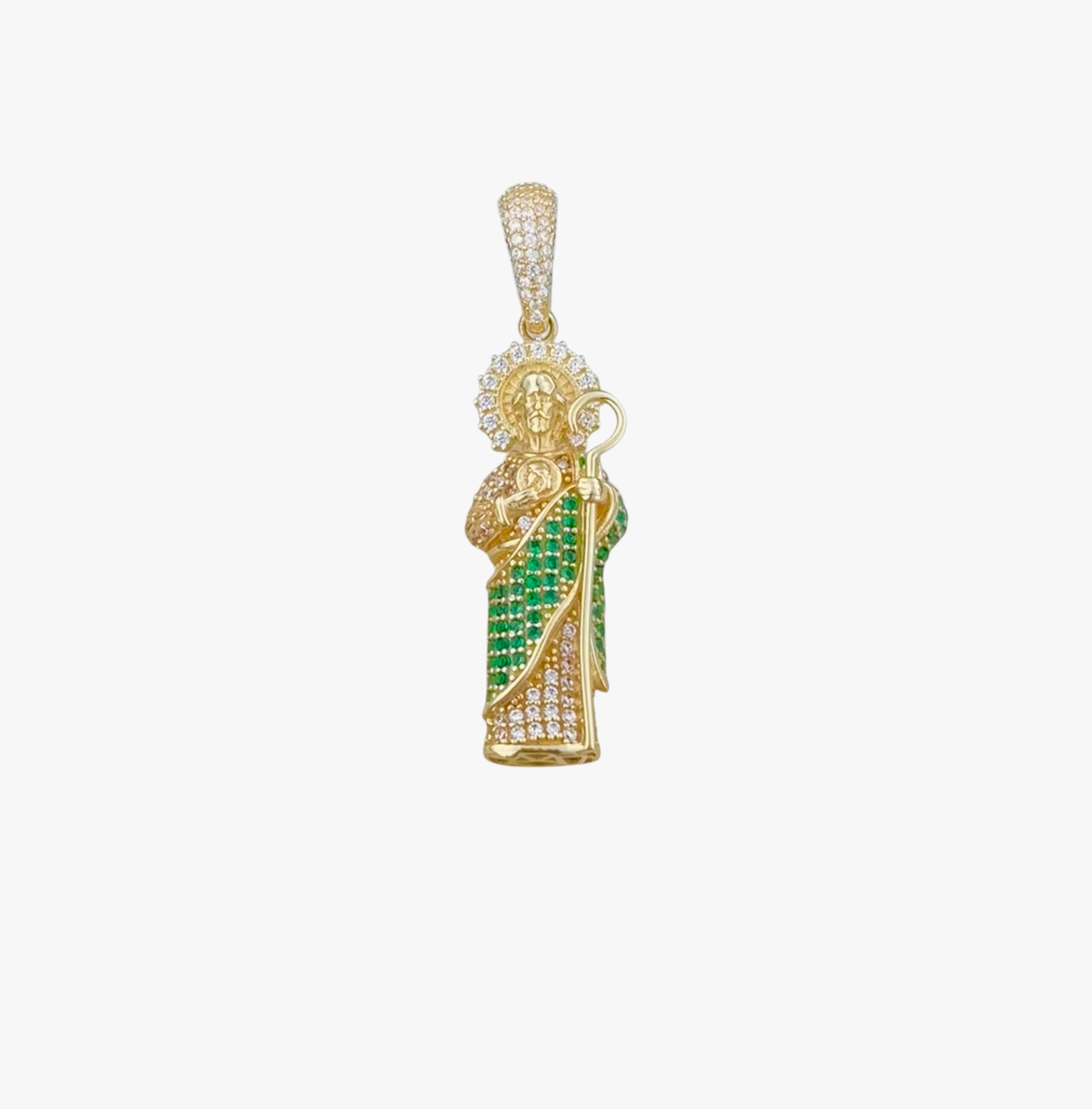 SAN JUDAS TADEO MANTO PENDANT EMERALD ZIRCONIA AND WHITE ZIRCONIA AND HANDLE WITH ZIRCONIA 10K GOLD
