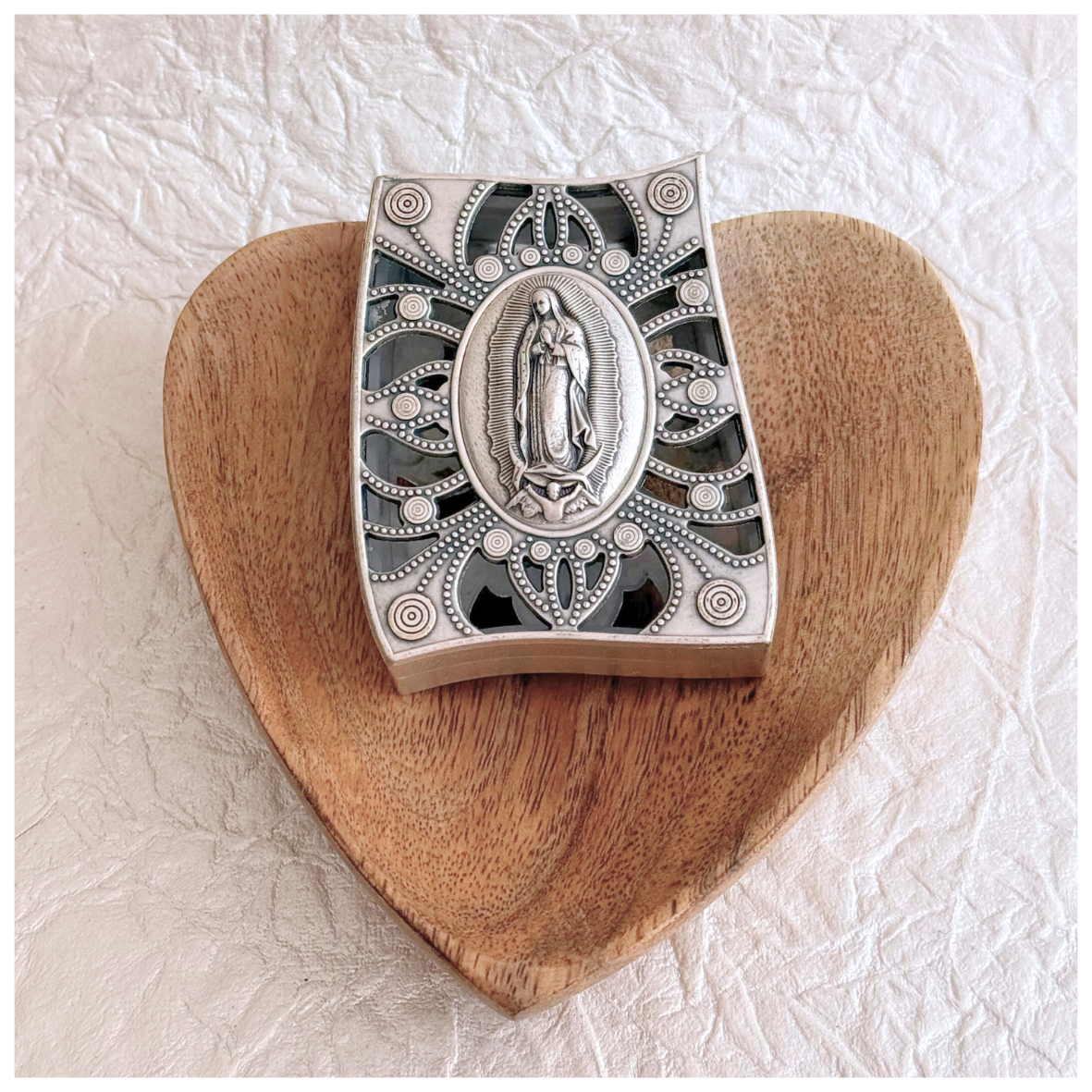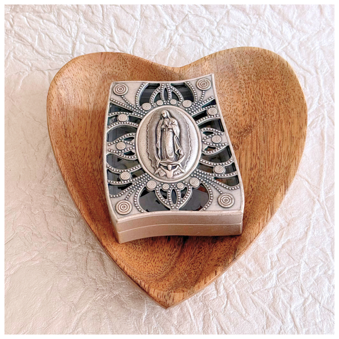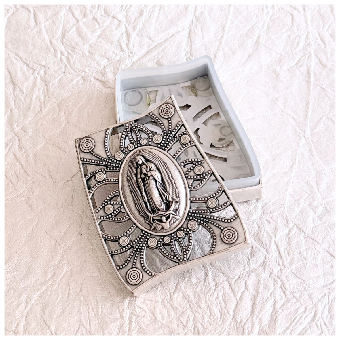 HERMOSO ALHAJERO Y PORTA ROSARIO DISEÑO EN FILIGRANA TERMINANDO ANTIGUO CON IMAGEN DE NUESTRA SEÑORA DE GUADALUPE