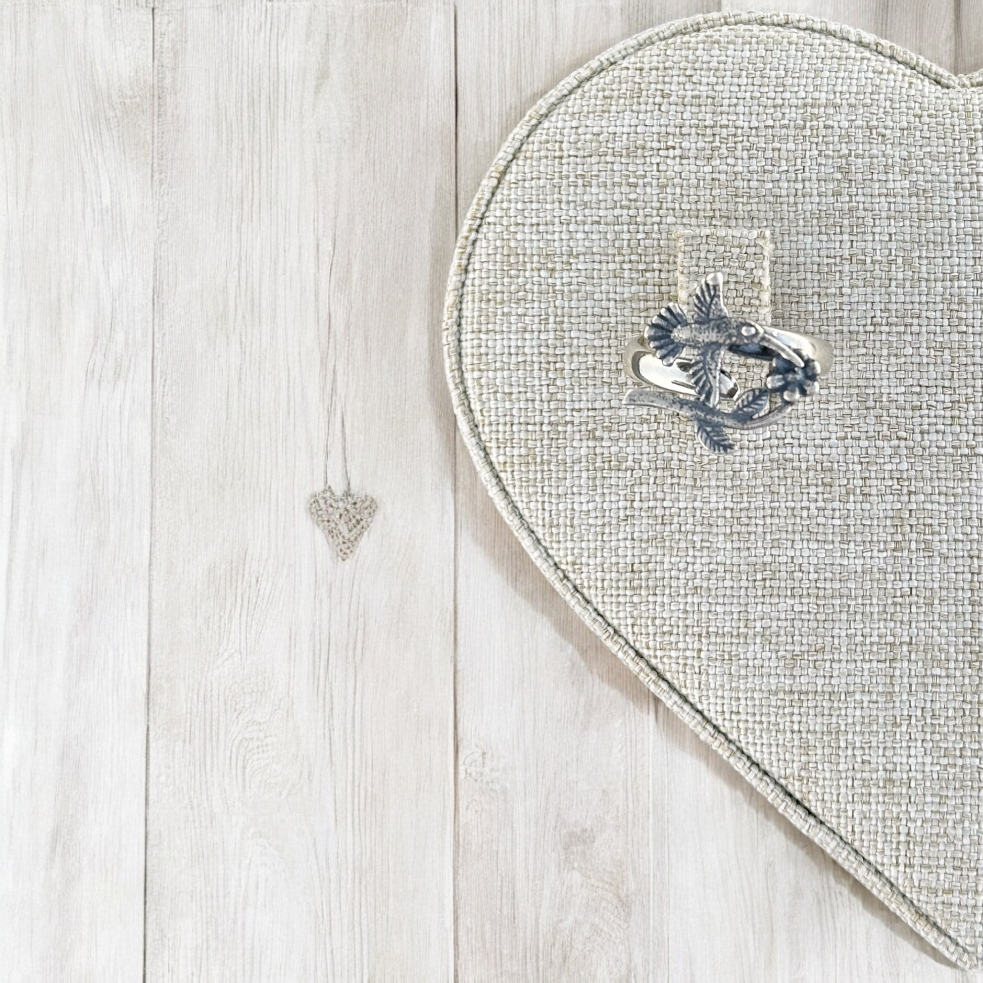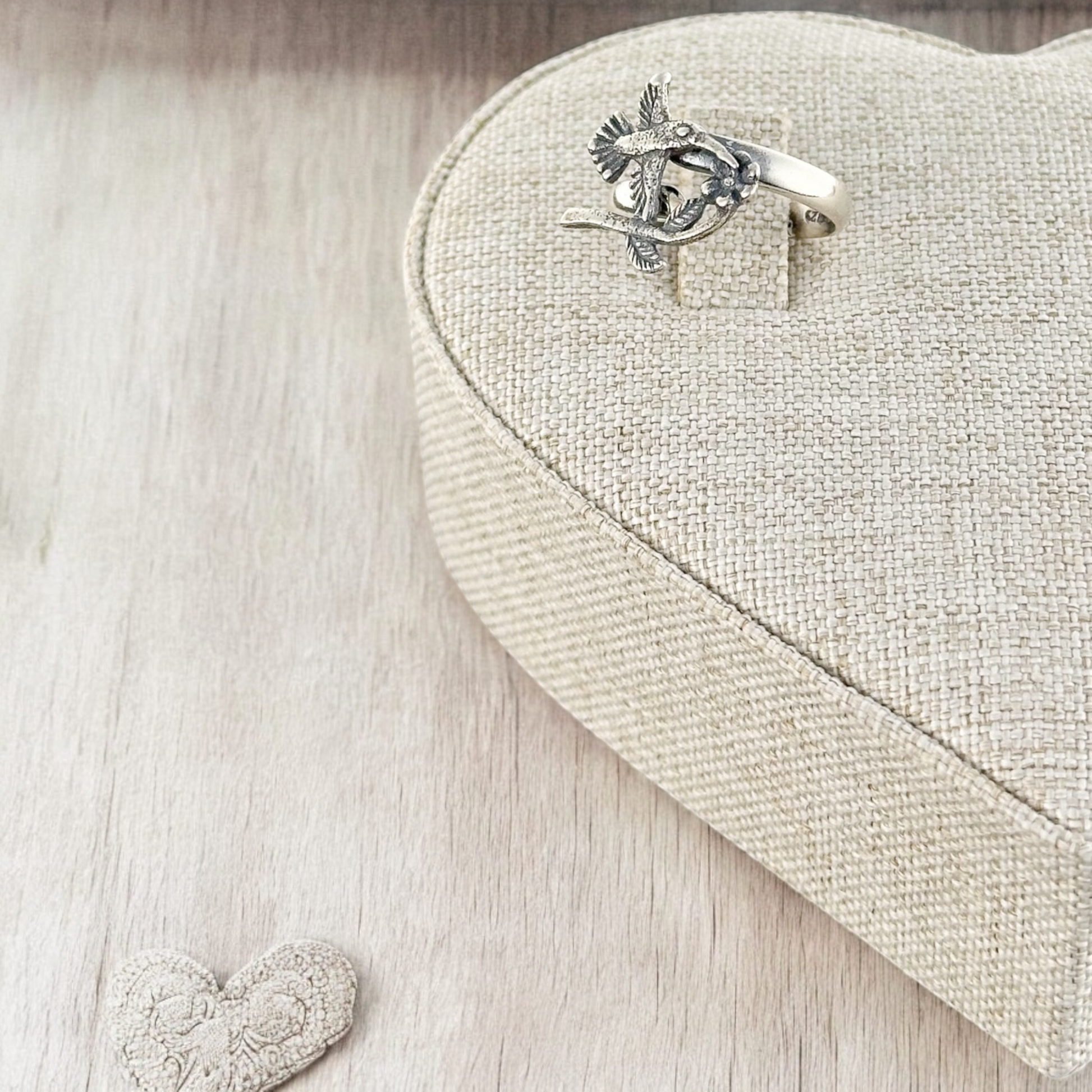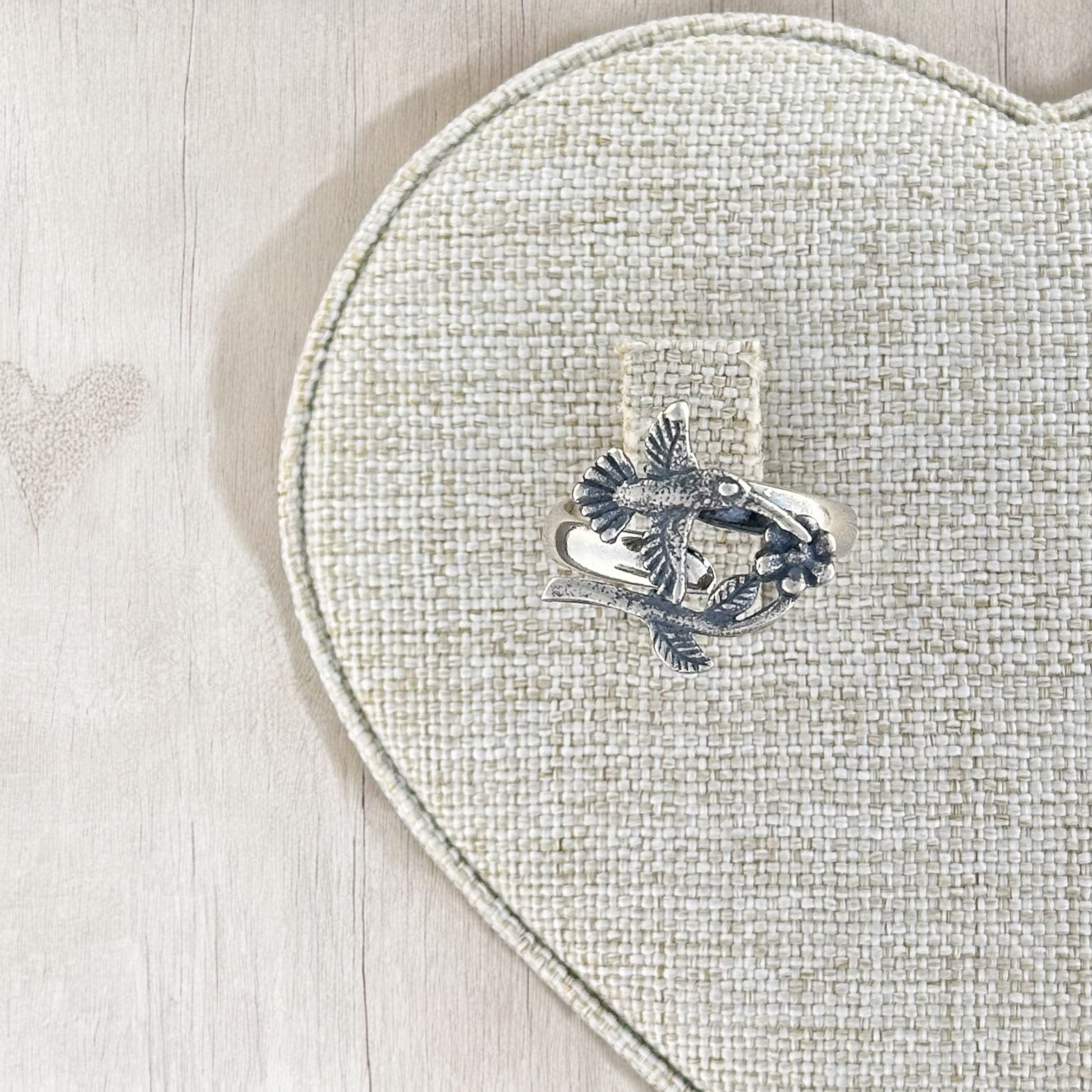 Anillo de plata .925 presenta un diseño de colibrí con una delicada flor enredada en su tallo.