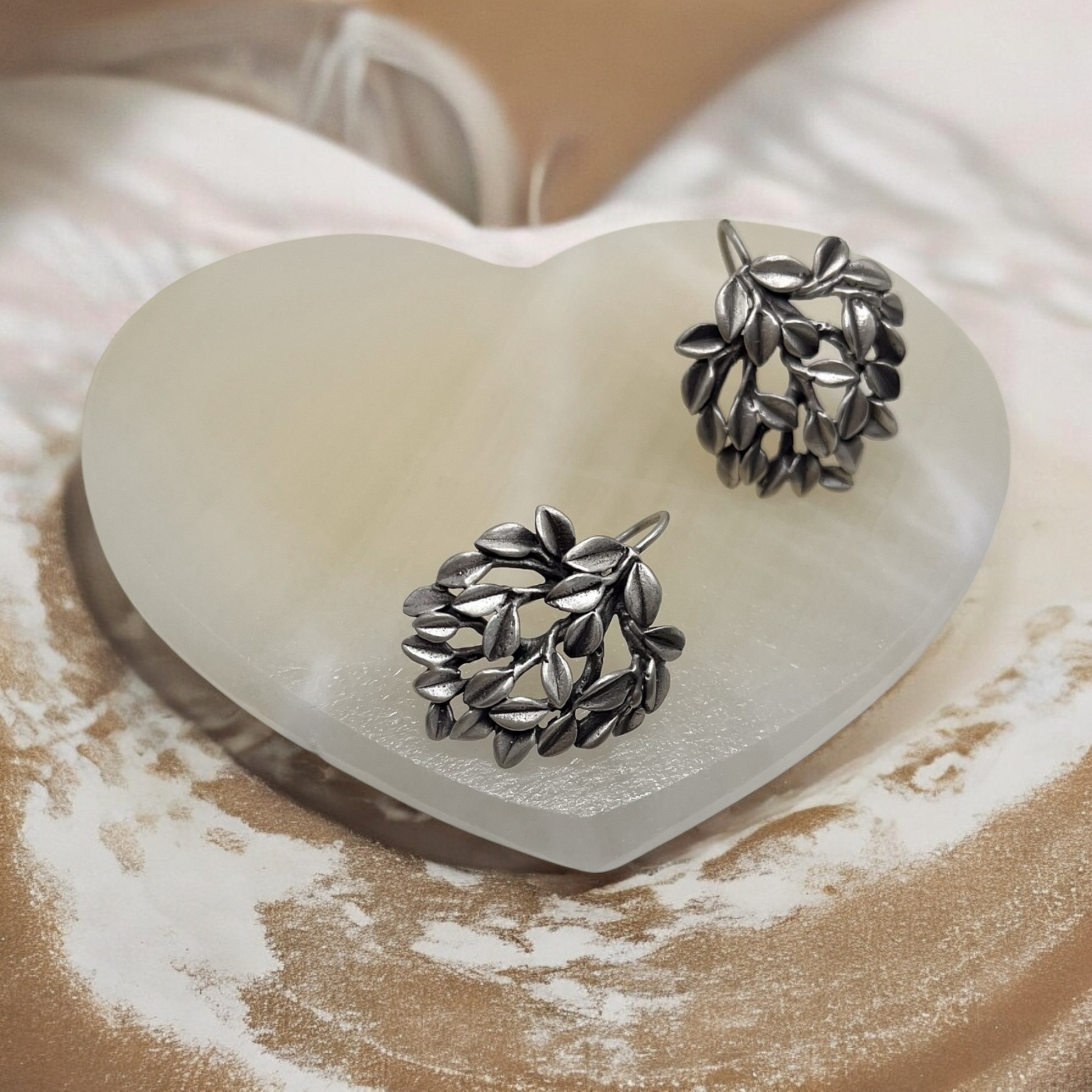 Arete de arillo de plata .925 con diseño de árbol y hojas. Hecho a mano con delicados detalles con terminado antiguo