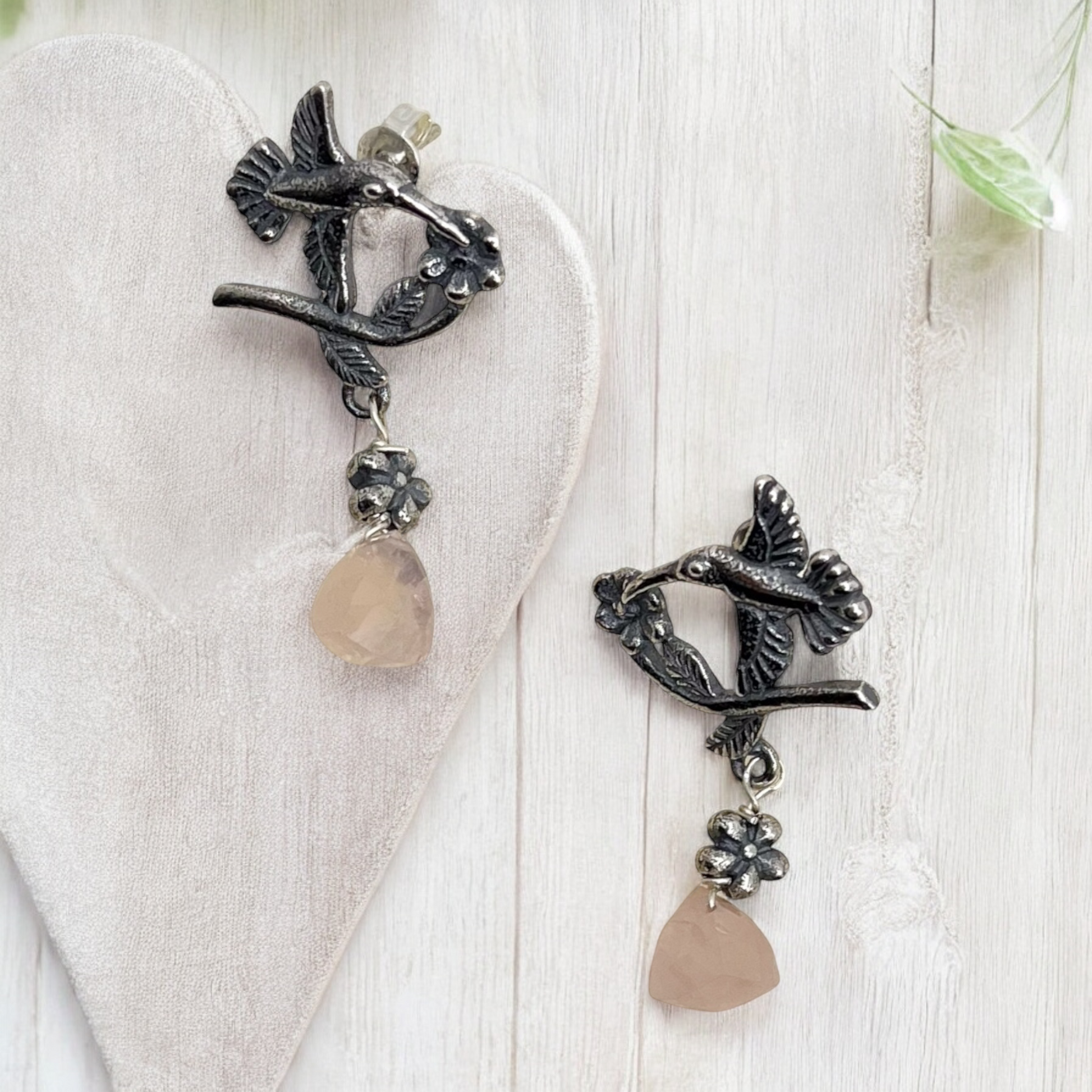 Arete de plata .925 con diseño de COLIBRI con una delicada flor enredada en su tallo con piedra de cuarzo colgante