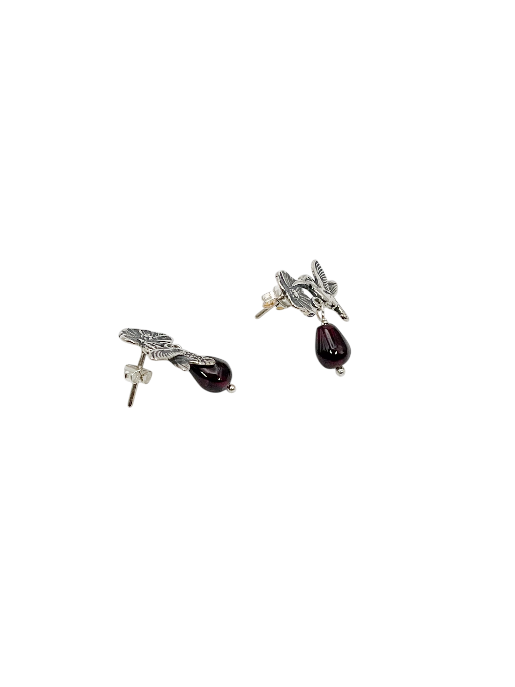 ARETE COLIBRI CON FLOR PIEDRA GRANATE COLGANTE PLATA .925
