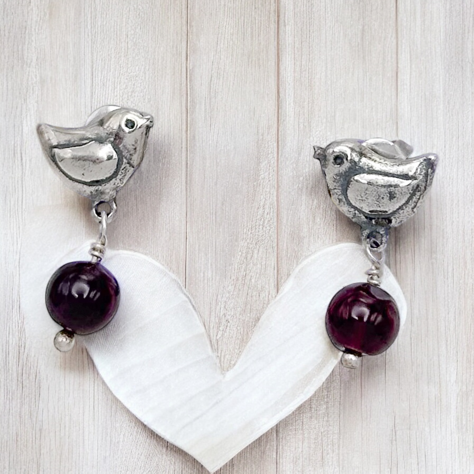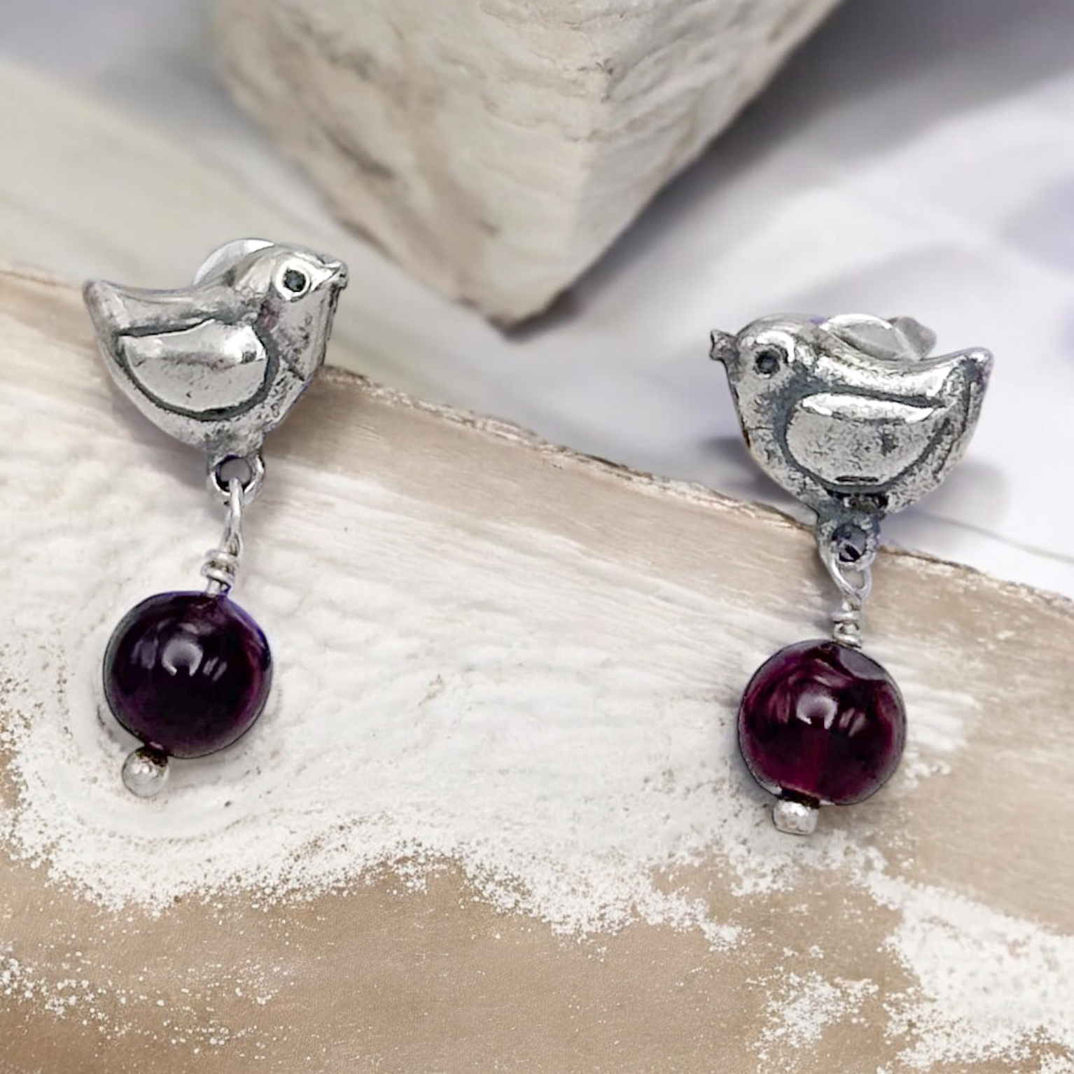 ARETE PAJARITO de plata .925 con terminado pavonado , con piedra natural colgante