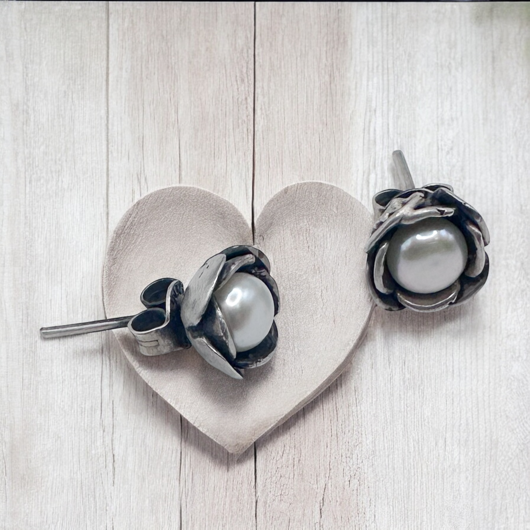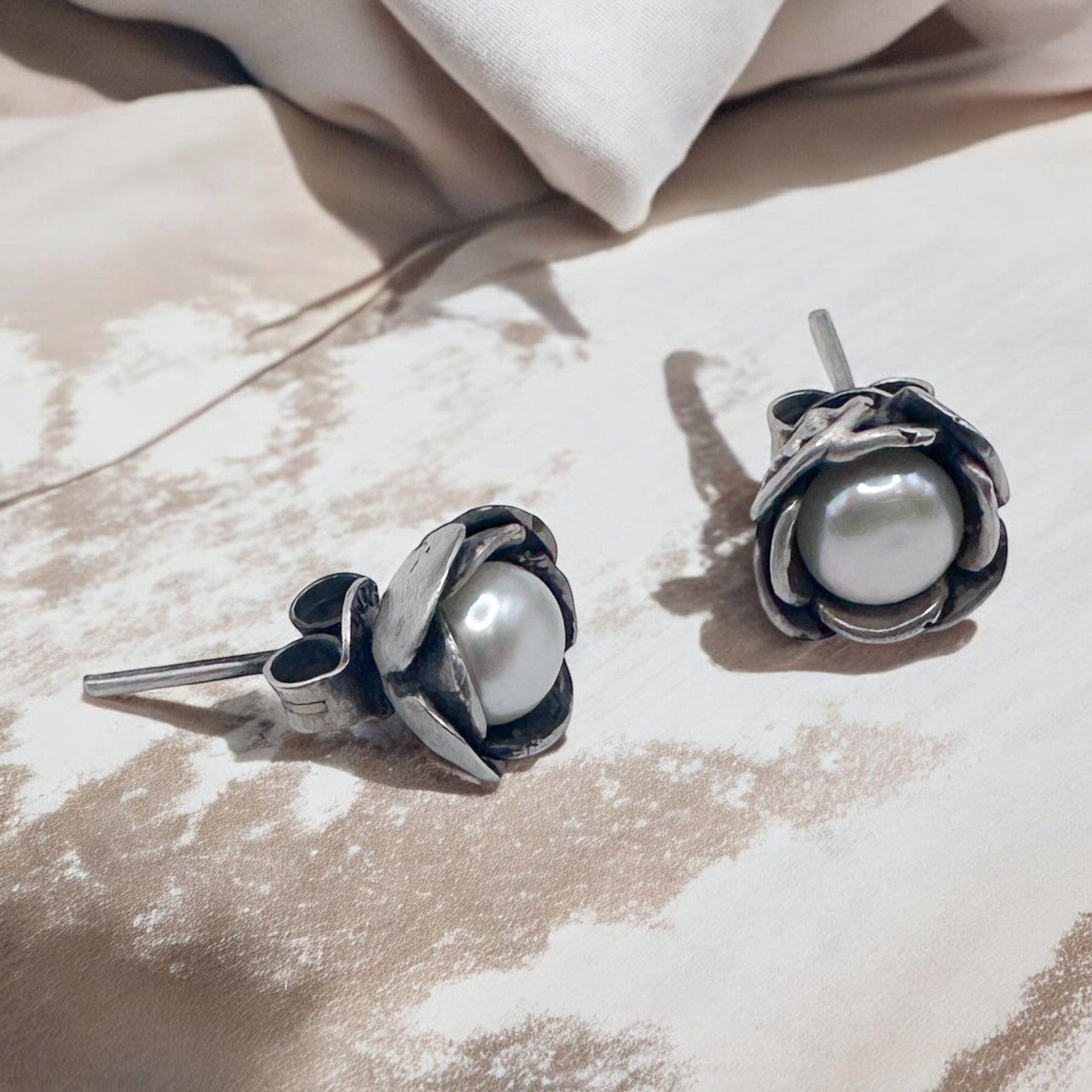 Arete FLOR PERLA ,botón de flor con perla en plata .925 con terminado antiguo