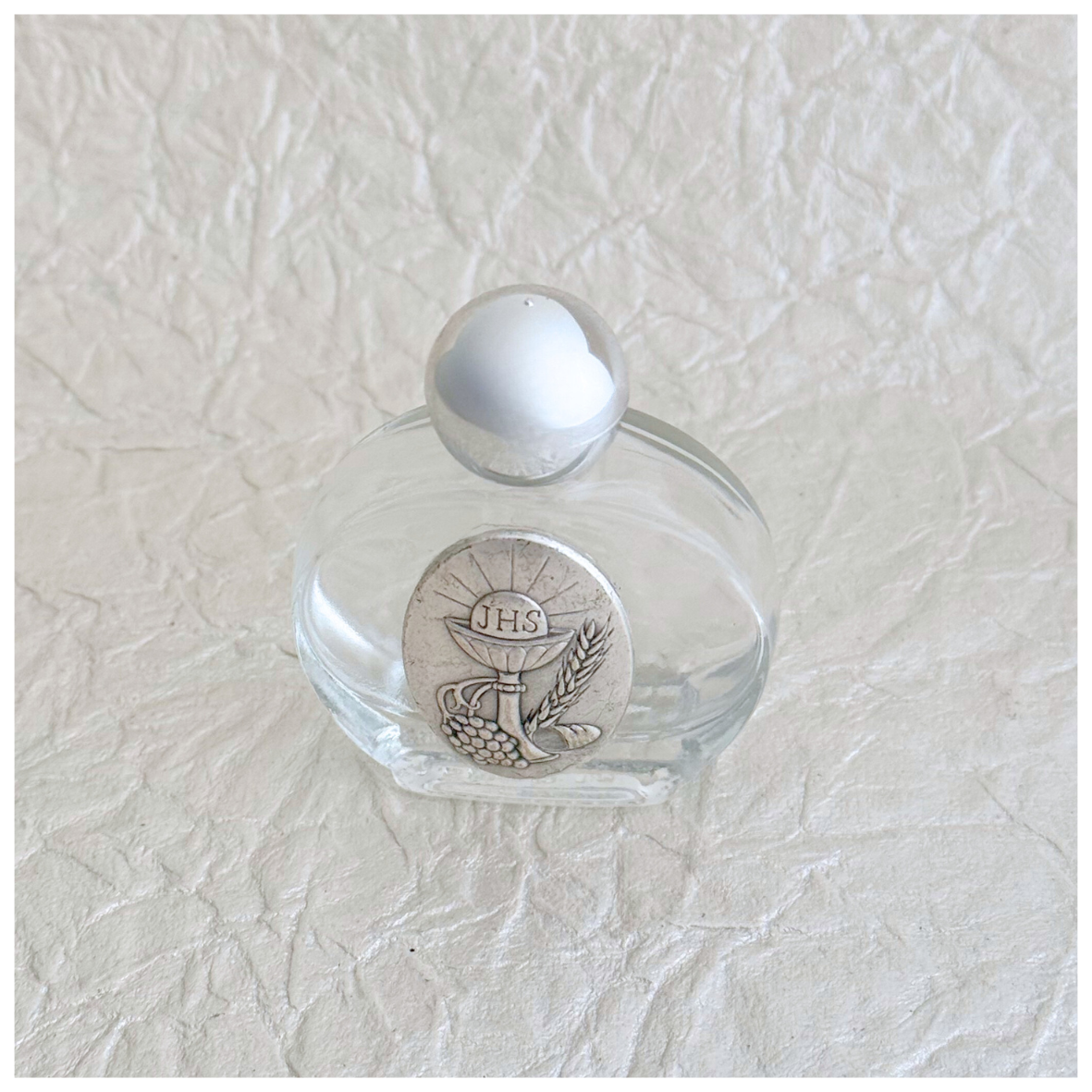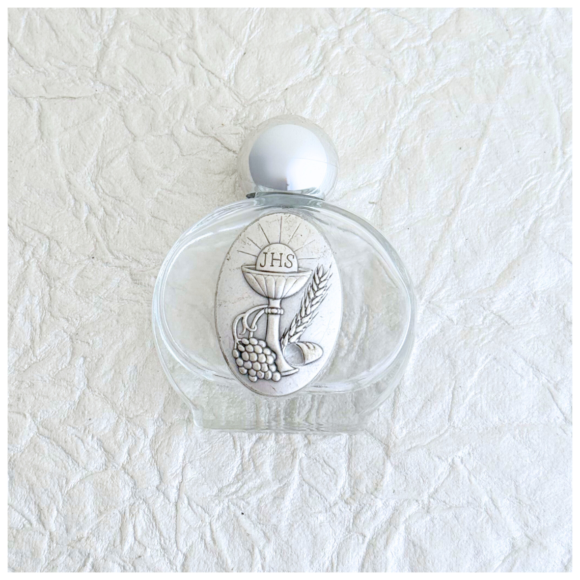 BOTELLITA OVAL CON MEDALLA DE PRIMERA COMUNION EN CRISTAL TRANSLUCIDO CON METAL ZAMAC ANTIOXIDANTE CON TAPA DE ROSCA CROMADA