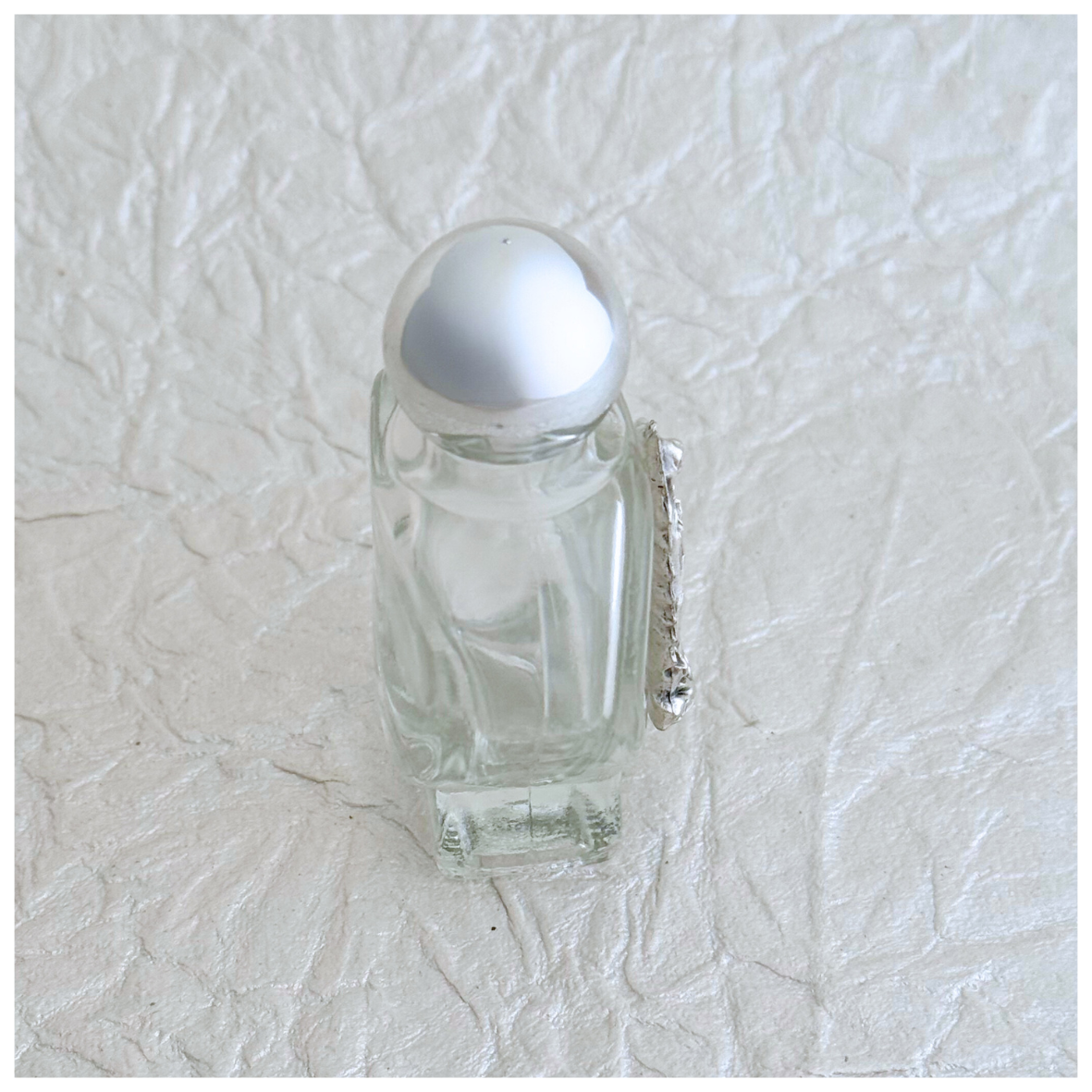 BOTELLITA CORAZON CON MEDALLA DE NUESTRA SEÑOTA DE GUADALUPE EN CRISTAL TRASLUCIDO CON METAL ZAMAC ANTIOXIDANTE CON TAPA DE ROSCA CROMADA