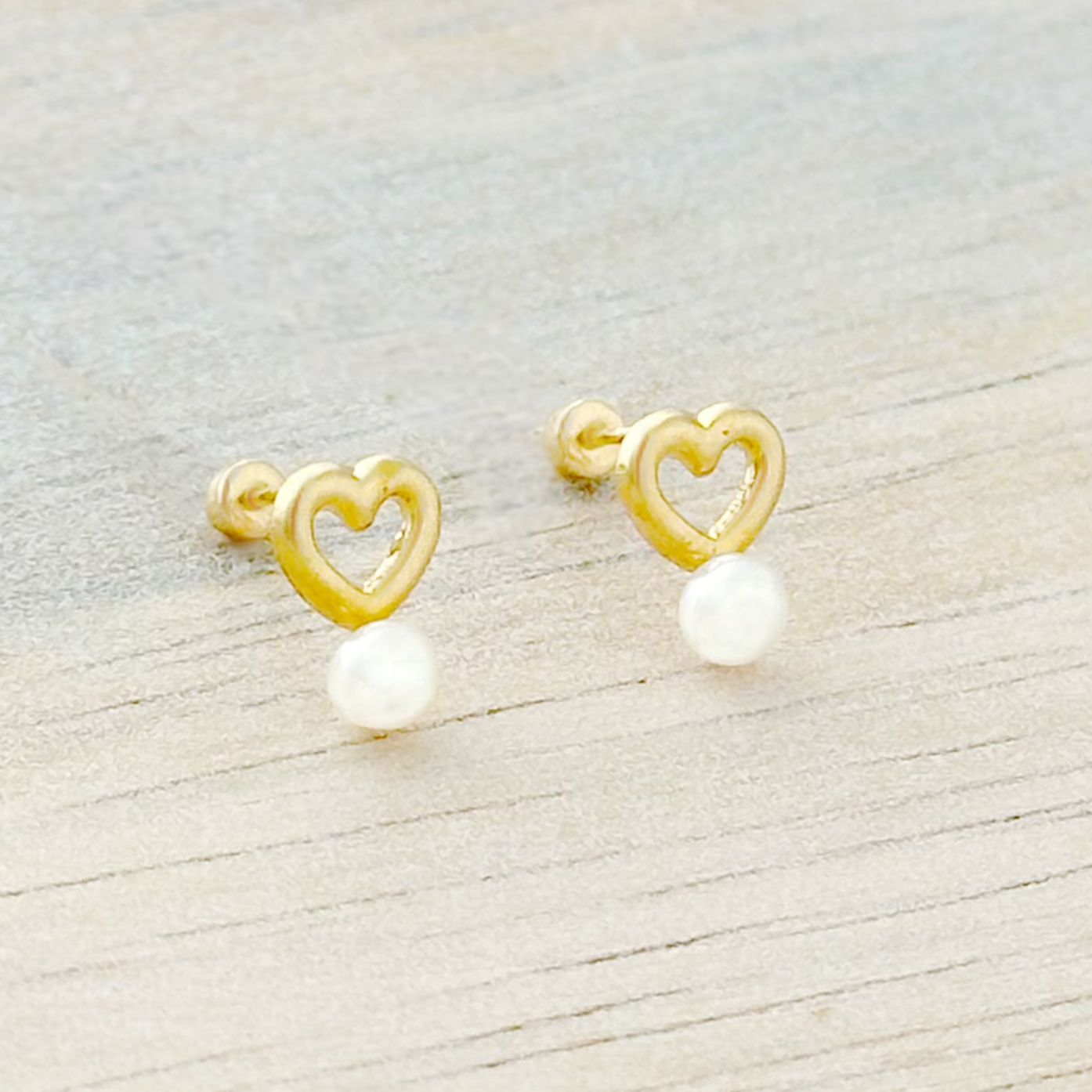 BROQUEL CORAZON CONTORNO LISO CON PERLA ORO 10K