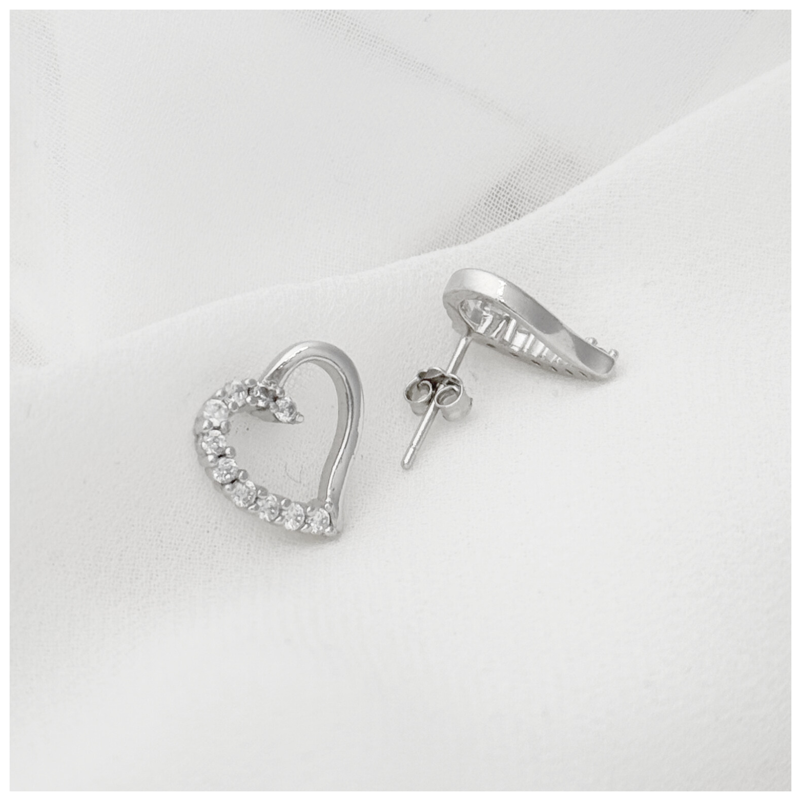 HERMOSO CORAZON MITAD LISO Y CIRCONIAS , ARETE CON POSTE FABRICADO EN PLATA .925 CON RODIO