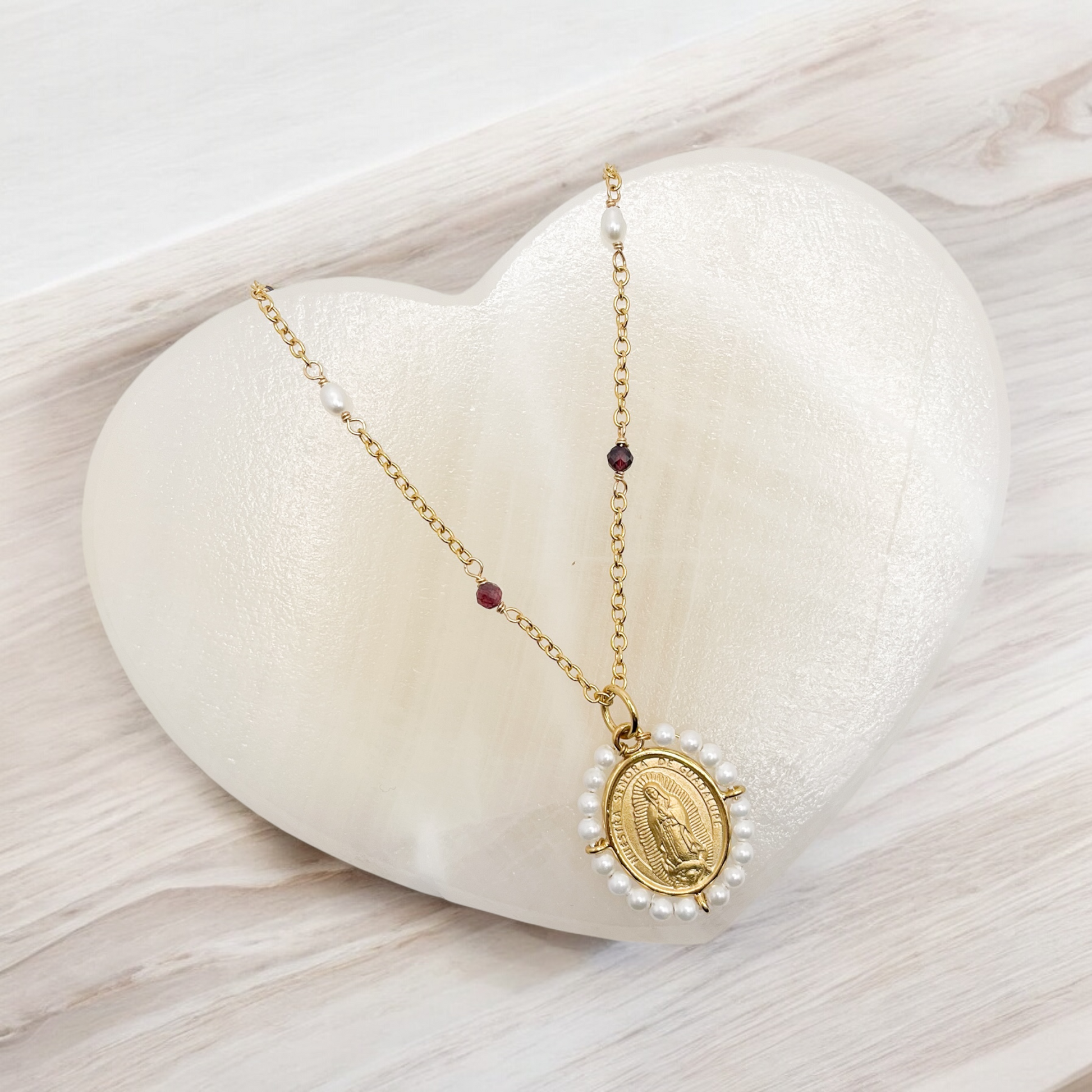 COLLAR VIRGEN DE GUADALUPE PERLA GRANATE CADENA CHAPA