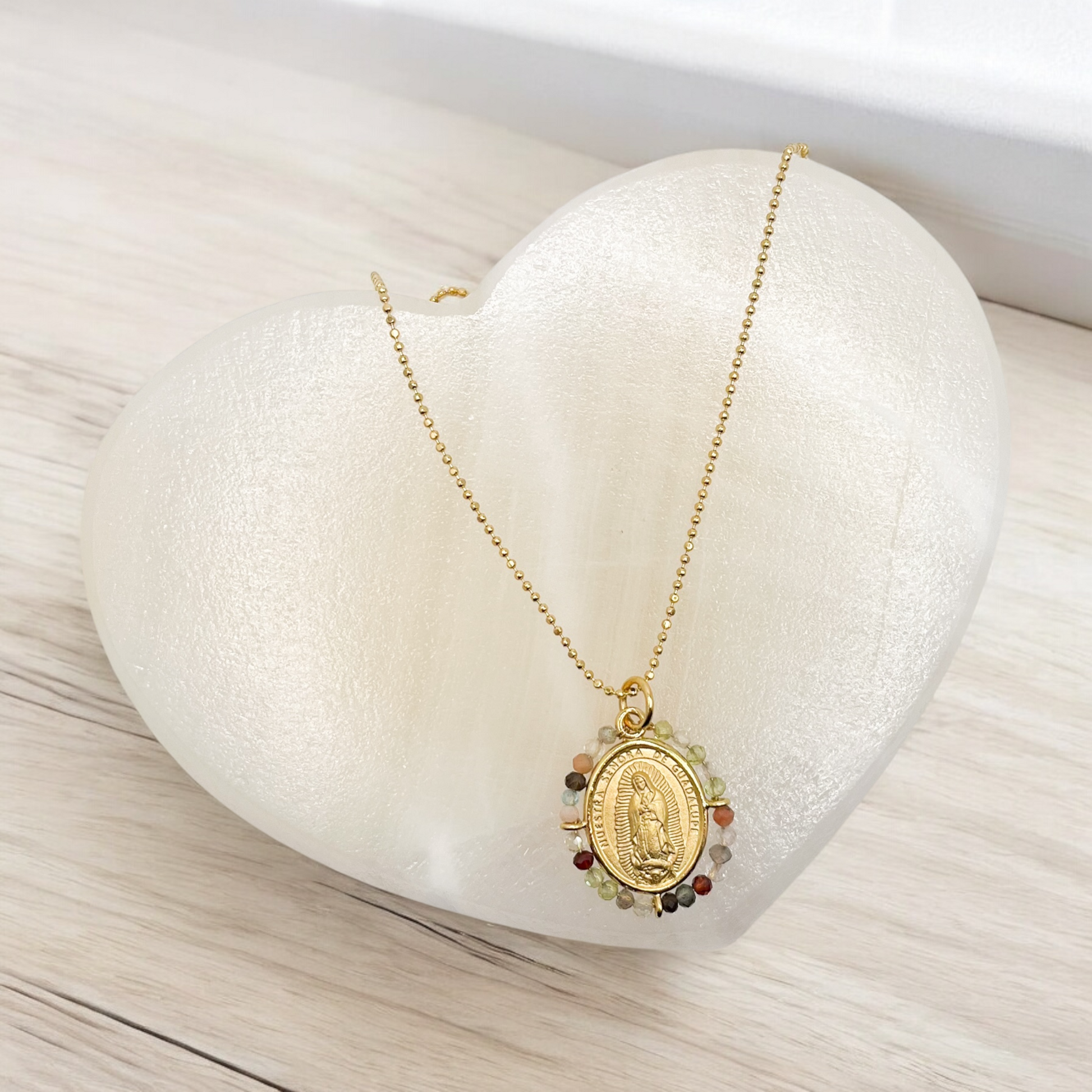 COLLAR VIRGEN DE GUADALUPE cadena chapa con medalla Virgen de Guadalupe bordada de piedras naturales