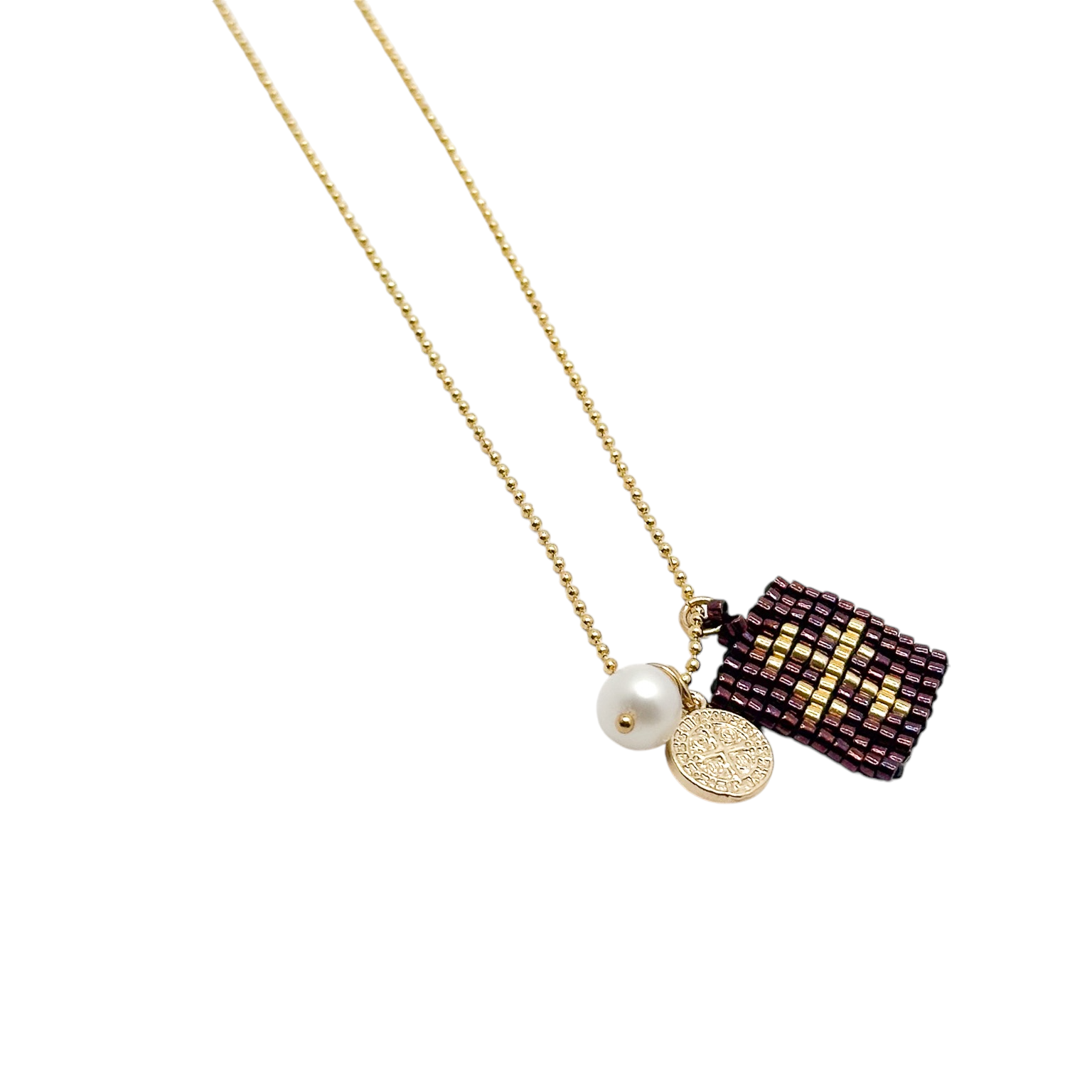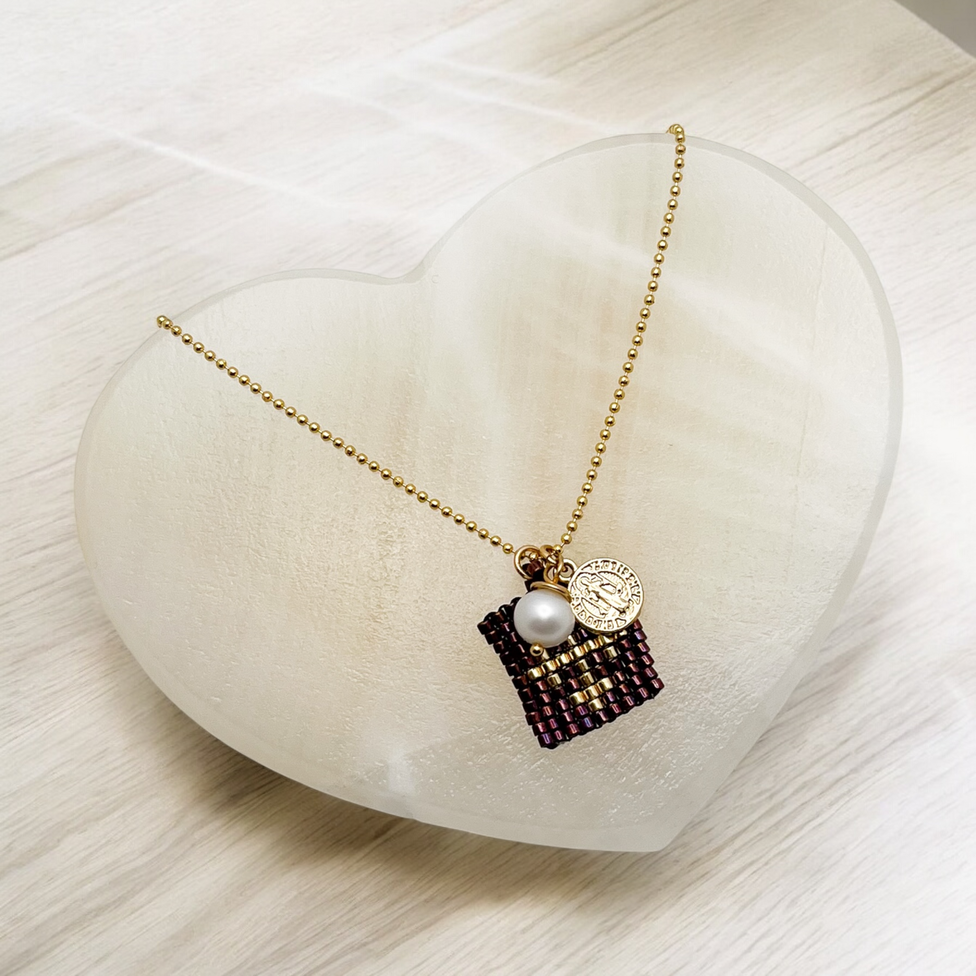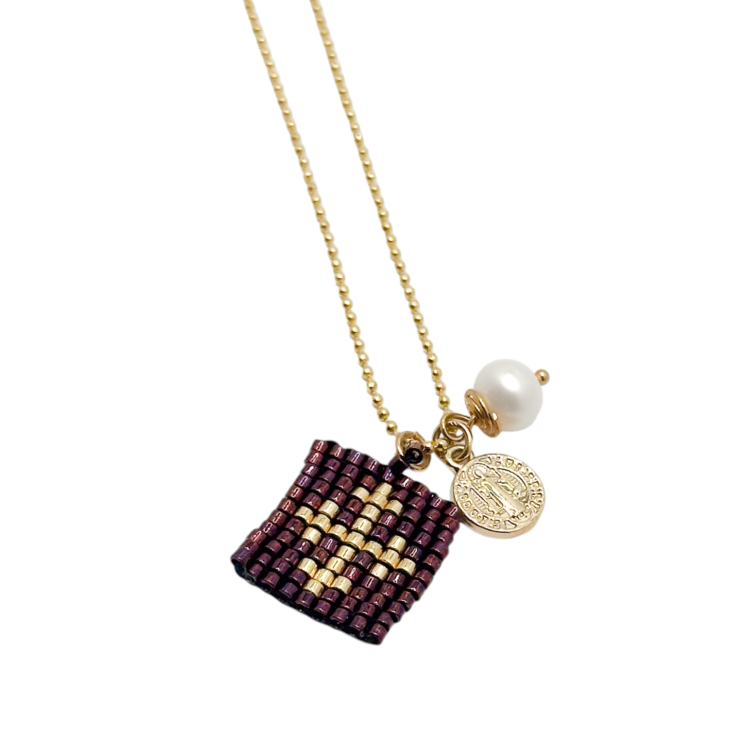 COLLAR ESCAPULARIO HUICHOL Cadena de chapa con dije de escapulario tejido huichol con medalla de San Benito y una perla