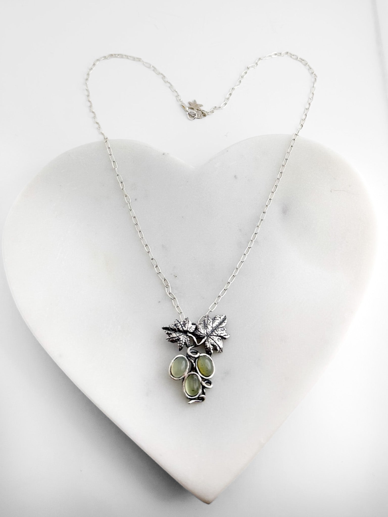 COLLAR RACIMO DE UVAS Cadena con dije de hojas de parra desiguales con uvas de piedra Jadeita en plata .925 con terminado pavonado