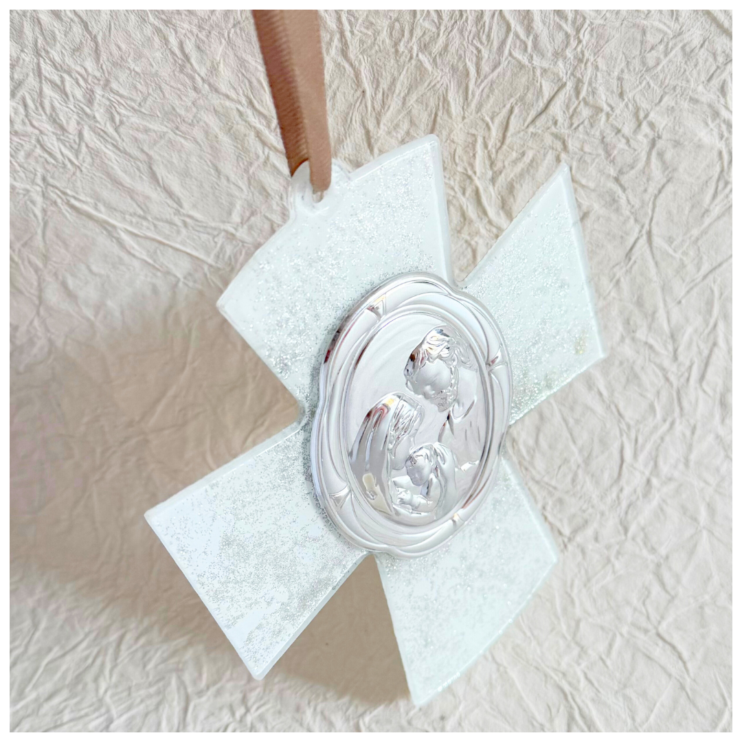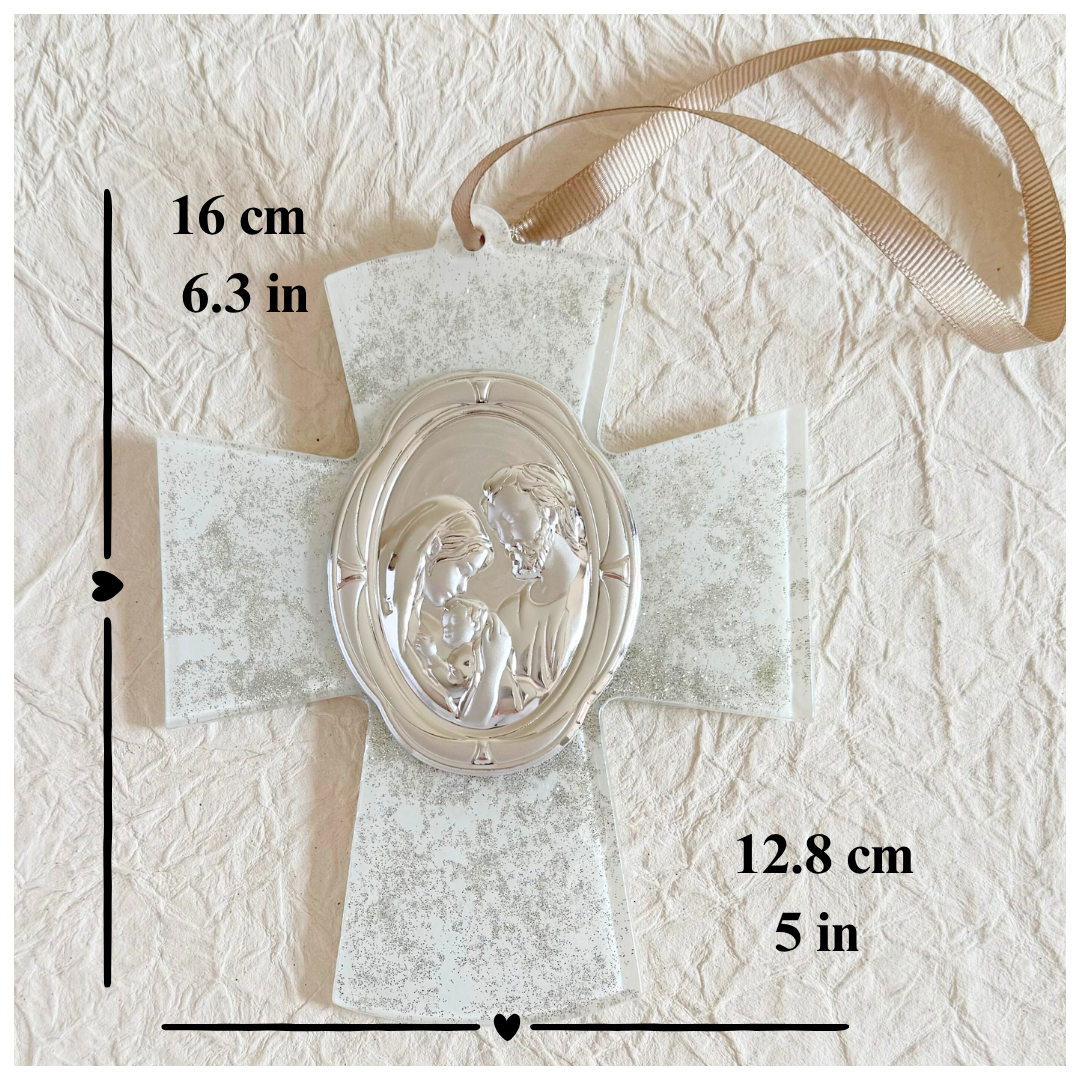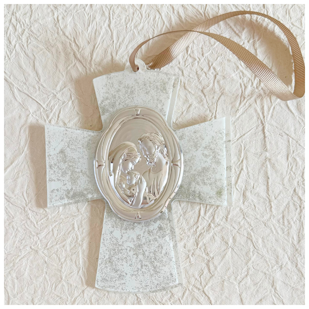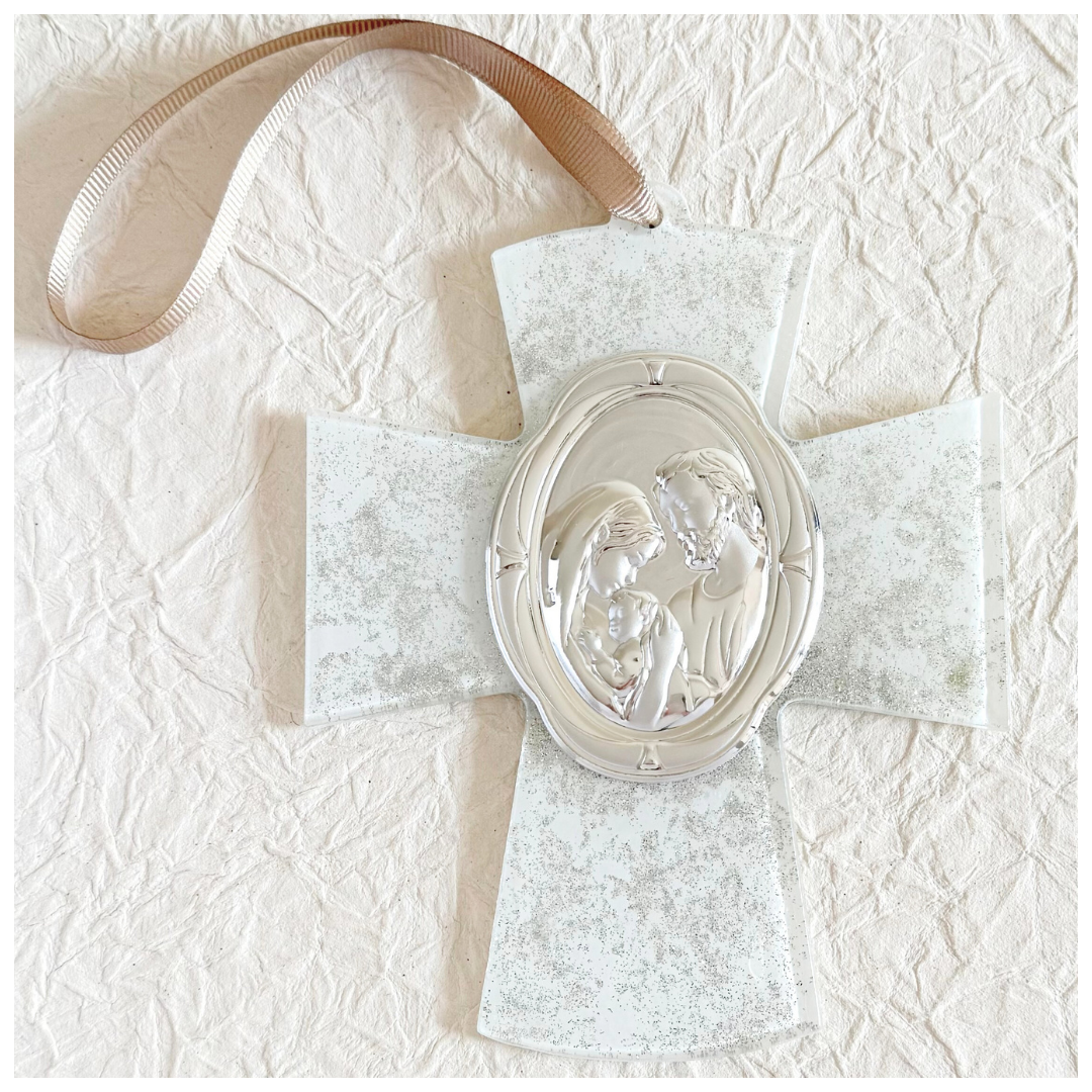 HERMOSA CRUZ DE CRISTAL DE MURANO COLOR BLANCO CON MEDALLON DE LA SAGRADA FAMILIA TALLADA EN PLATA .925