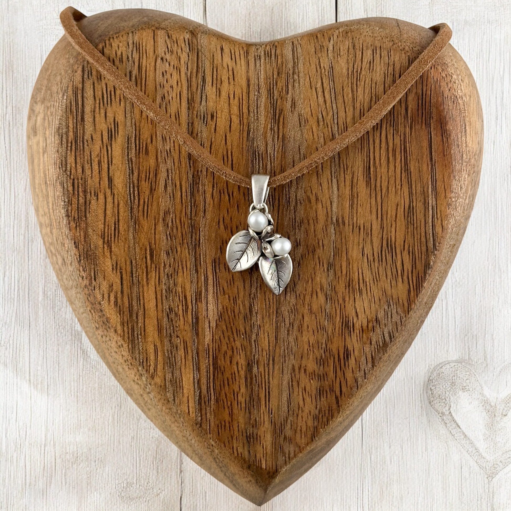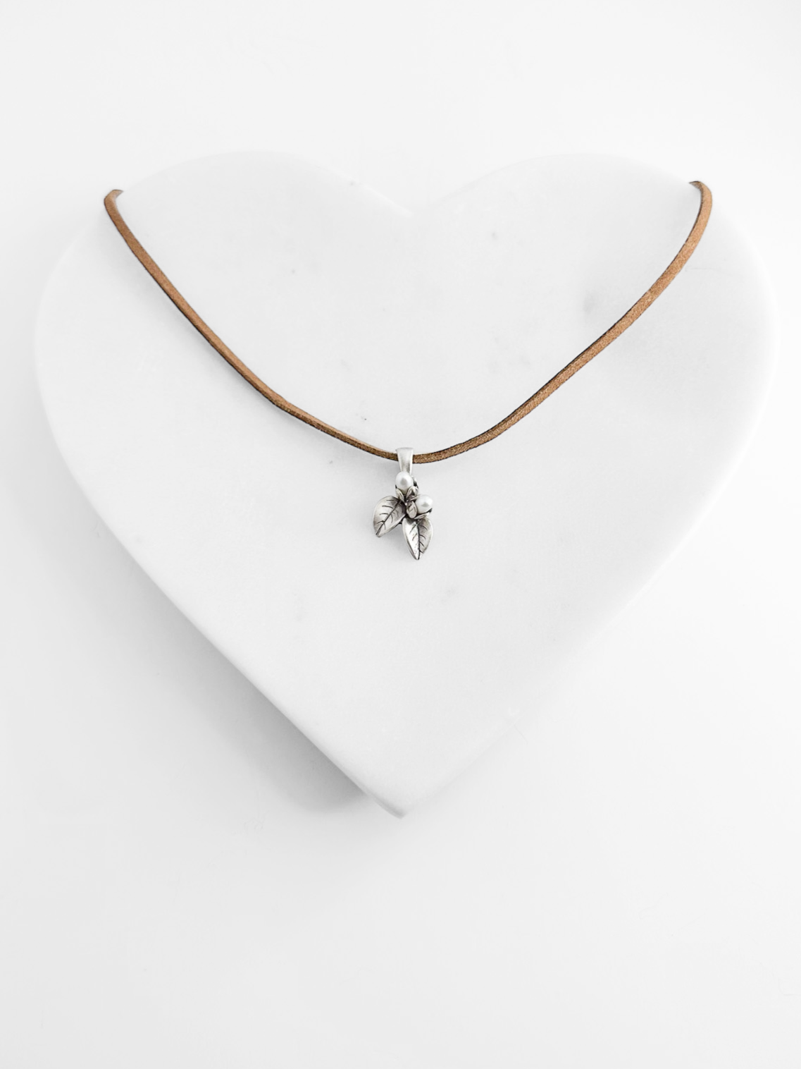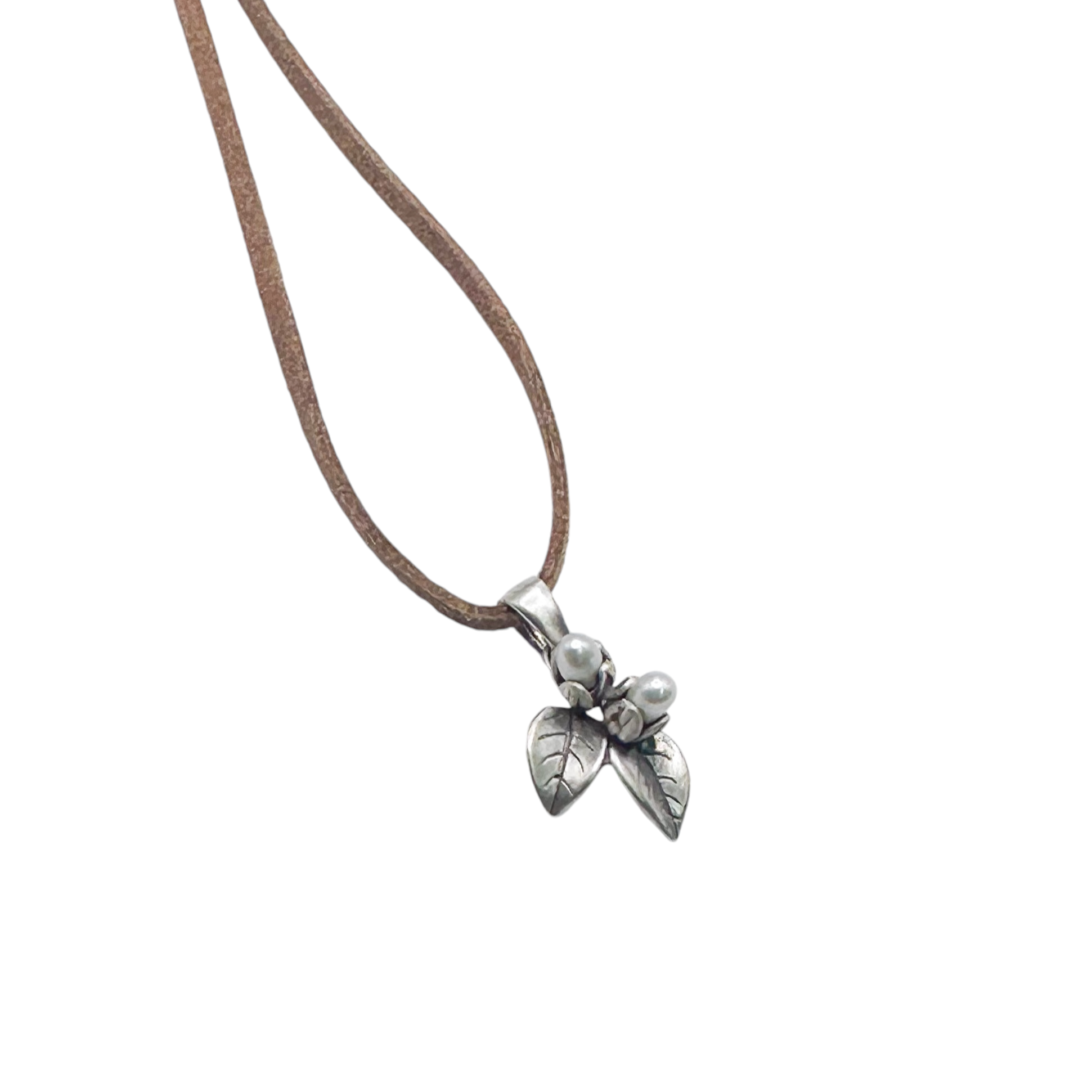 DIJE FLORES Collar gamuza con dije dos flores con perla y hojas en plata .925 terminado antiguo