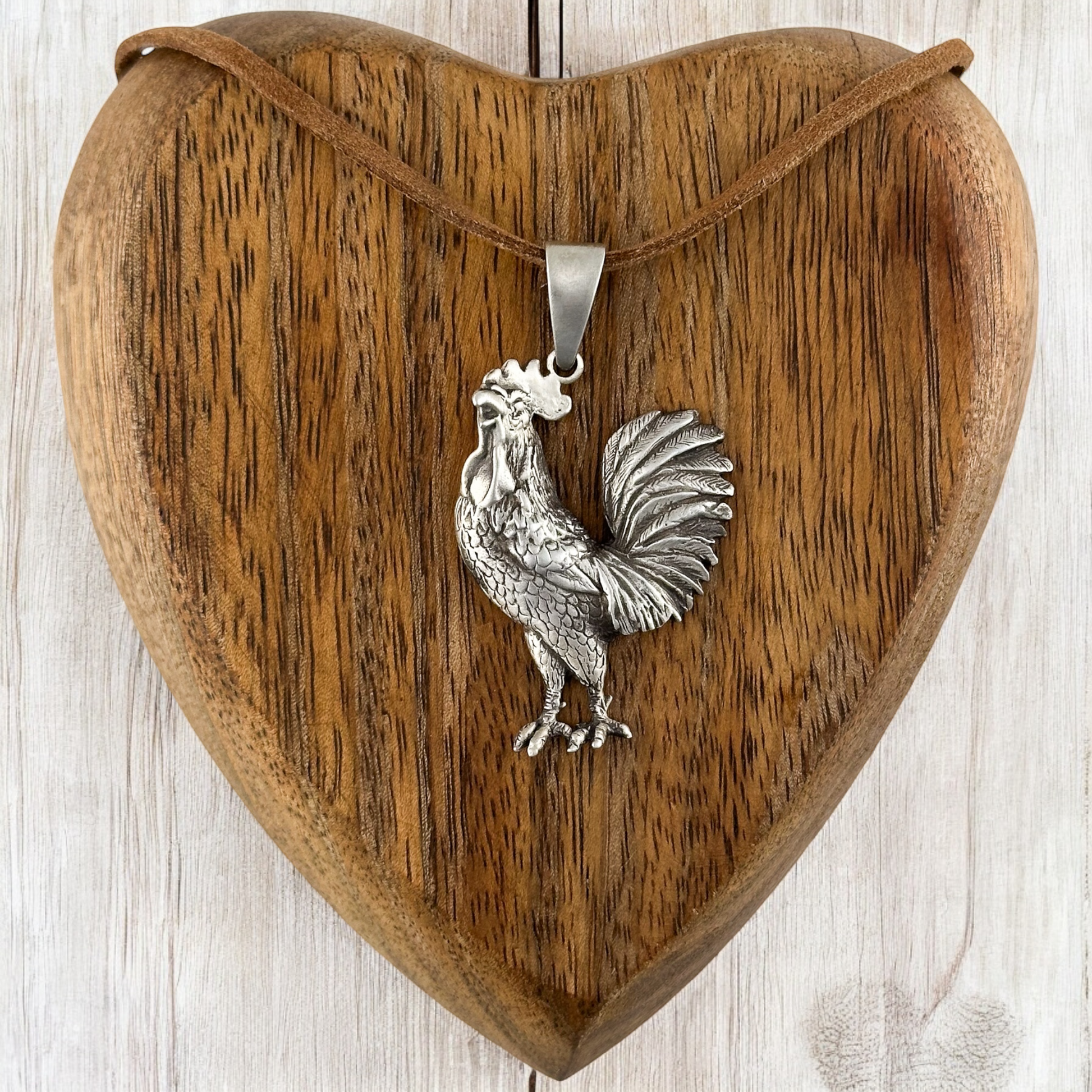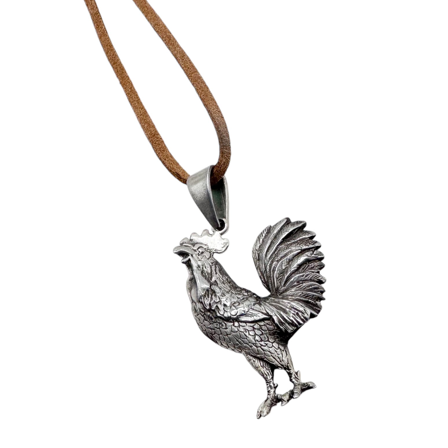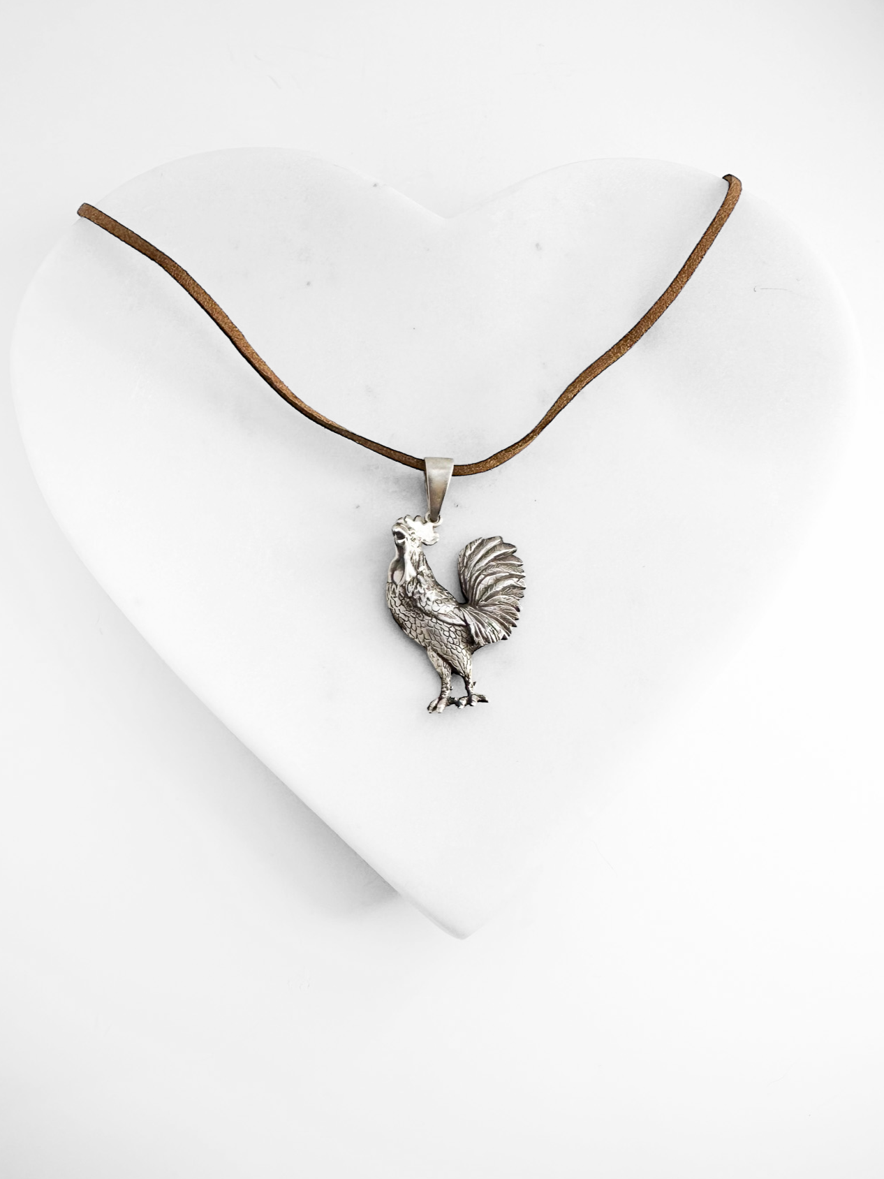 DIJE GALLO Collar gamuza con dije de gallo en plata .925 con terminado antiguo