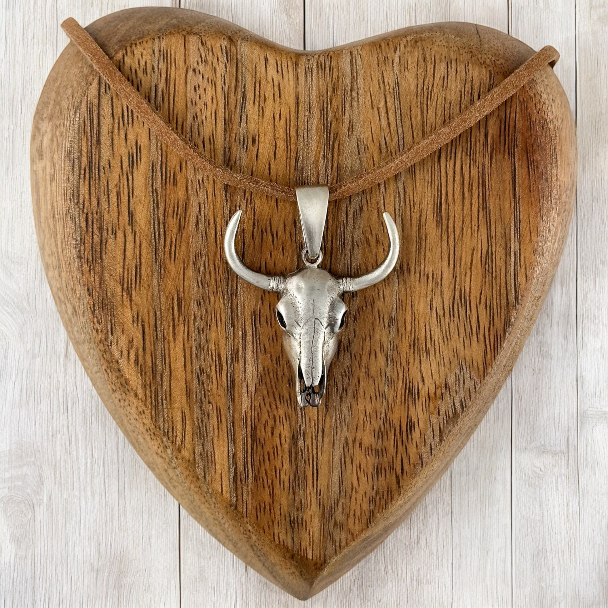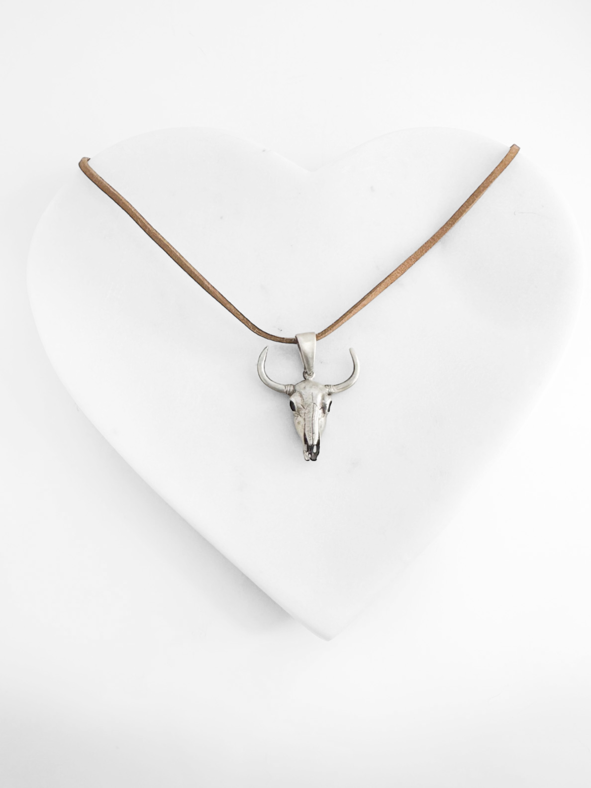 DIJE CABEZA DE TORO Collar gamuza con dije de cabeza de toro en plata .925 terminado antiguo