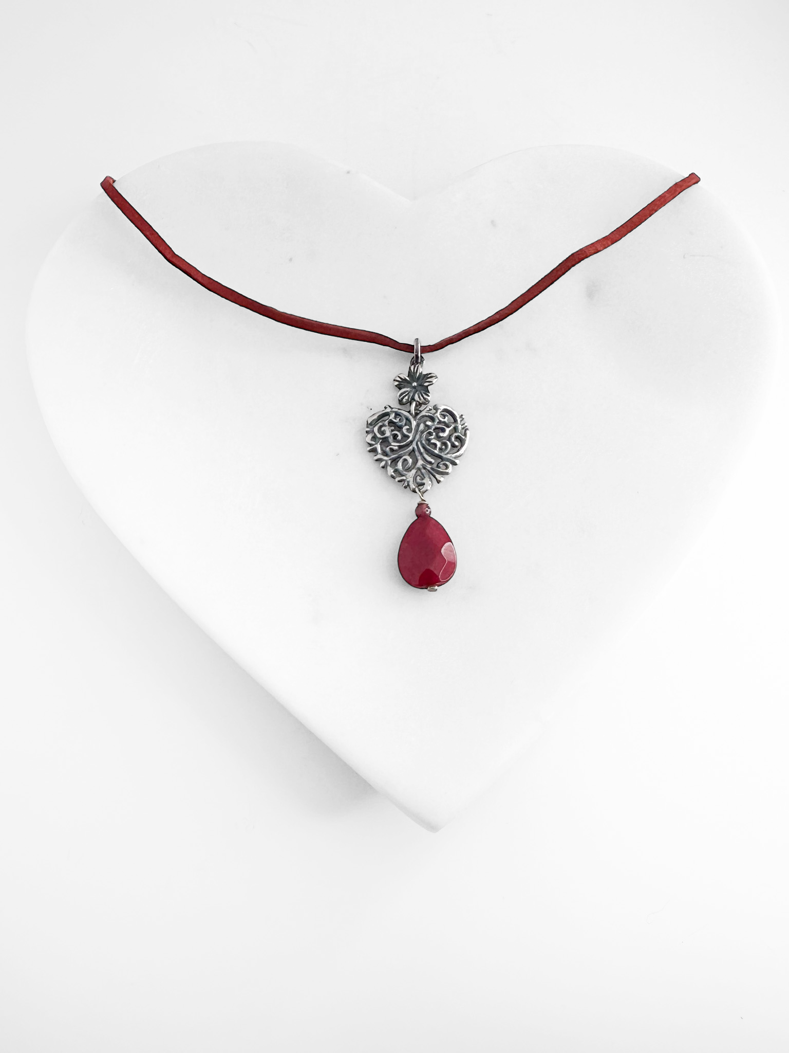 DIJE CORAZON GUIAS Collar gamuza con dije corazón guías con piedra ágata colgante en plata .925 con terminado pavonado