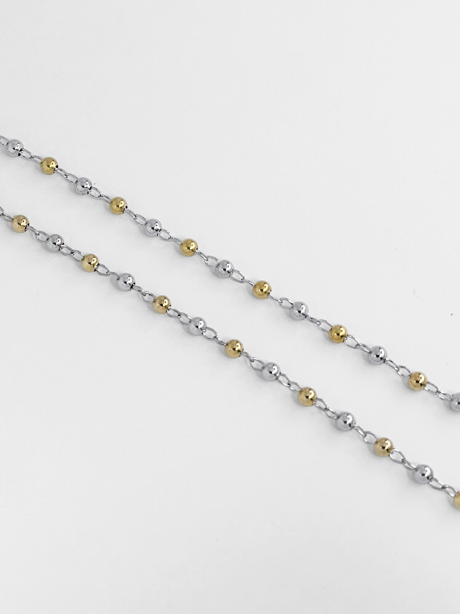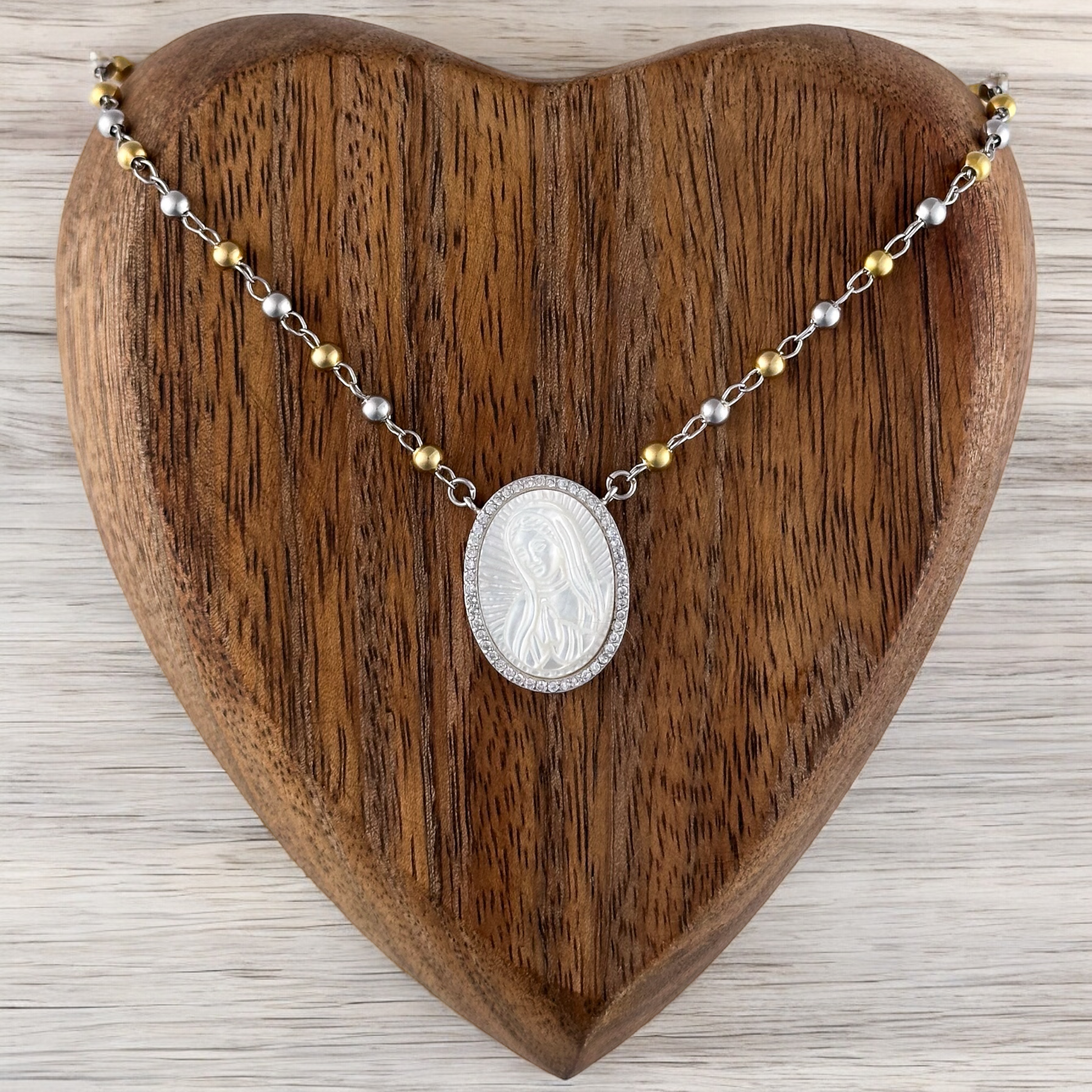 COLLAR VIRGEN DE GUADALUPE Cadena esfera dorada y blanca con medalla oval en perla tallada Virgen de Guadalupe con zirconias plata .925