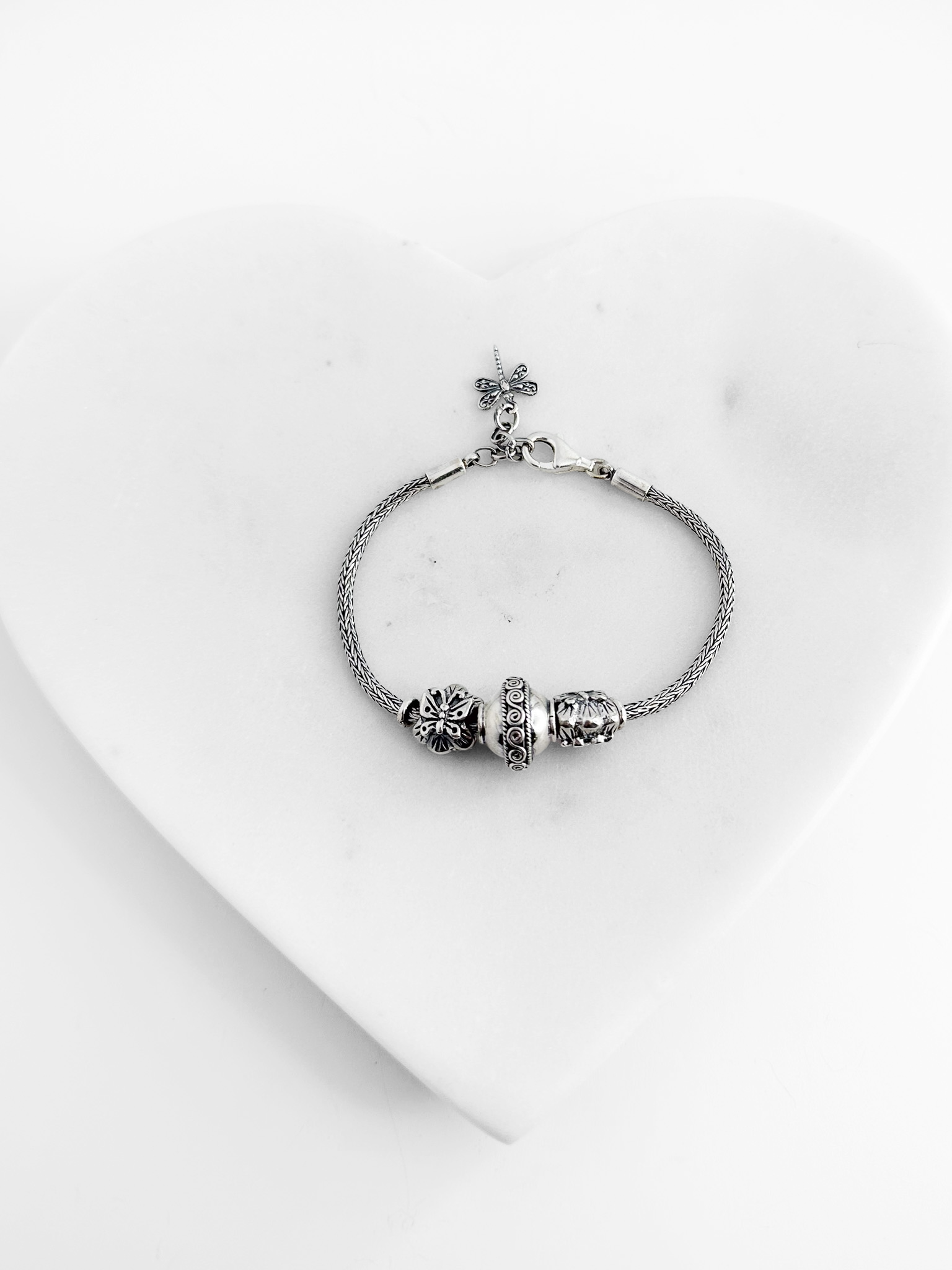 PULSERA LIBELULA. Pulsera con dijes esfera de mariposas al centro y su dije de libélula colgante en el broche , Hecho en plata .925