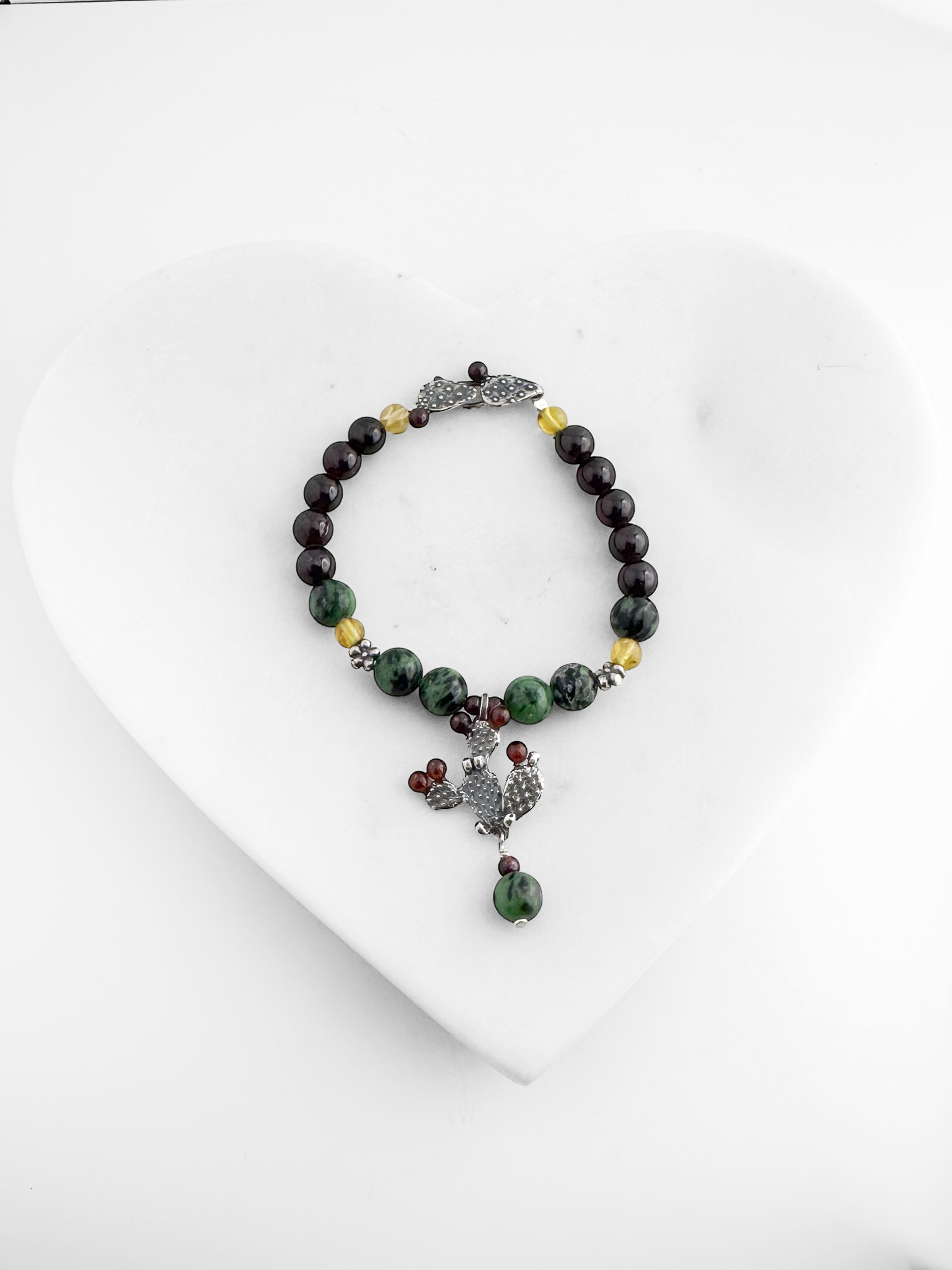 PULSERA NOPAL con piedras naturales ámbar, granate, y matriz de rubí ,con dije de diseño de nopal y broche de nopal en plata .925 con terminado pavonado