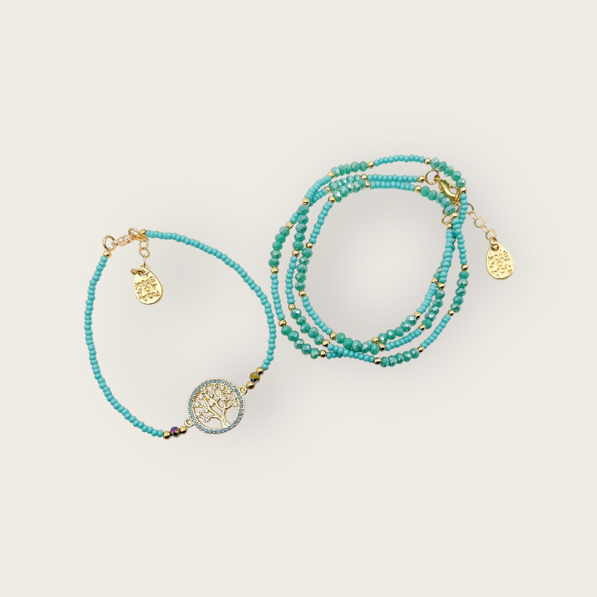 PULSERA CHAQUIRA ARBOL DE LA VIDA TURQUESA . Juego de dos piezas . Pulsera engarzada a mano chaquira azul turquesa y dorado , con DIJE ARBOL DE LA VIDA al centro en chapa con broche .
