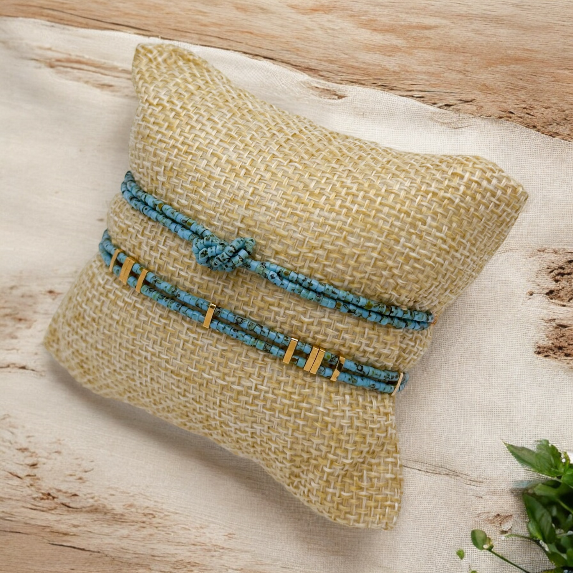 PULSERA NUDO DOS HILOS .Juego dos pulseras . Pulsera nudo turquesa ,pulsera dos hilos turquesa con tiras de chapa , con broche tejido ajustable
