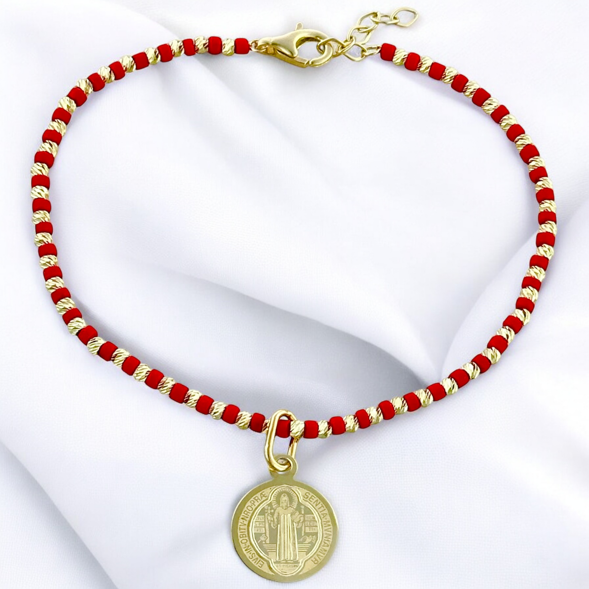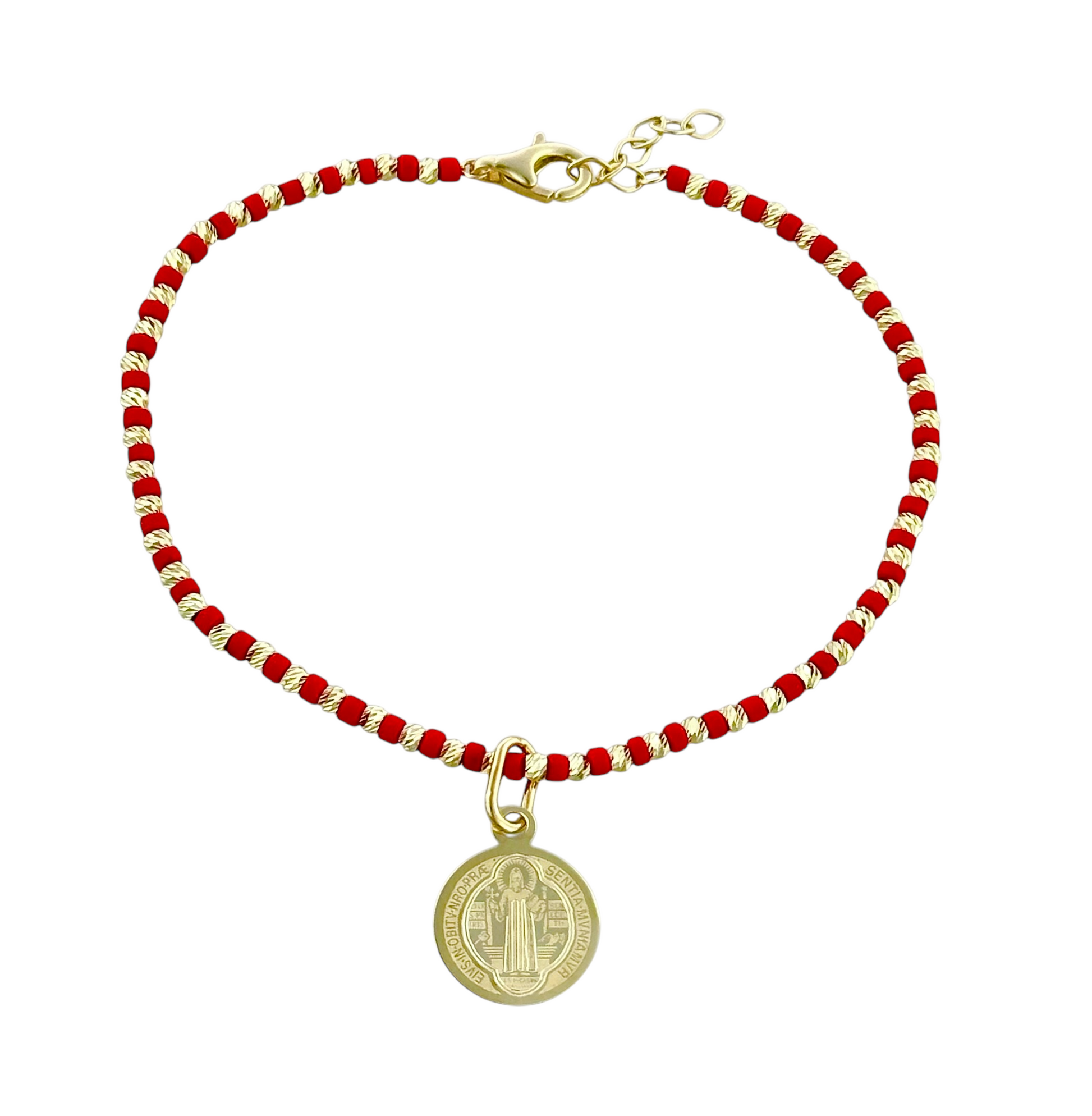 Pulsera con piedra natural y medalla San Benito en oro 10k