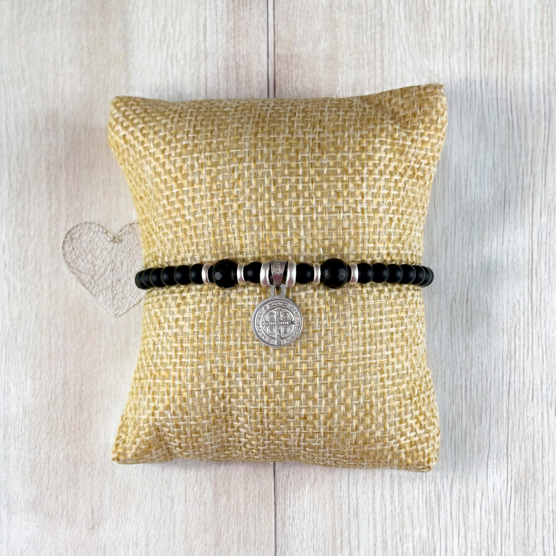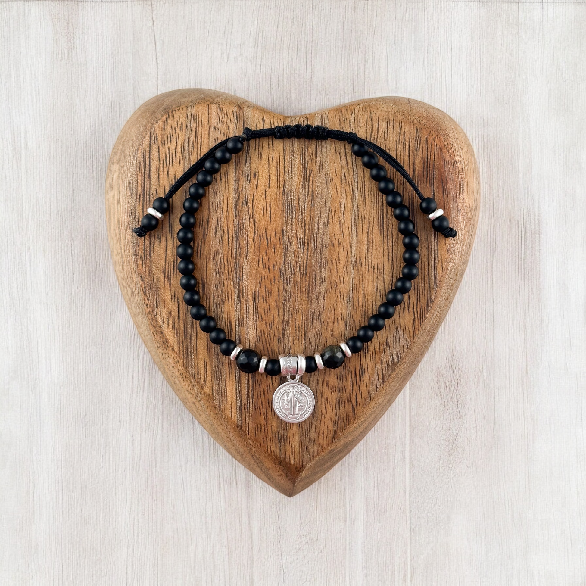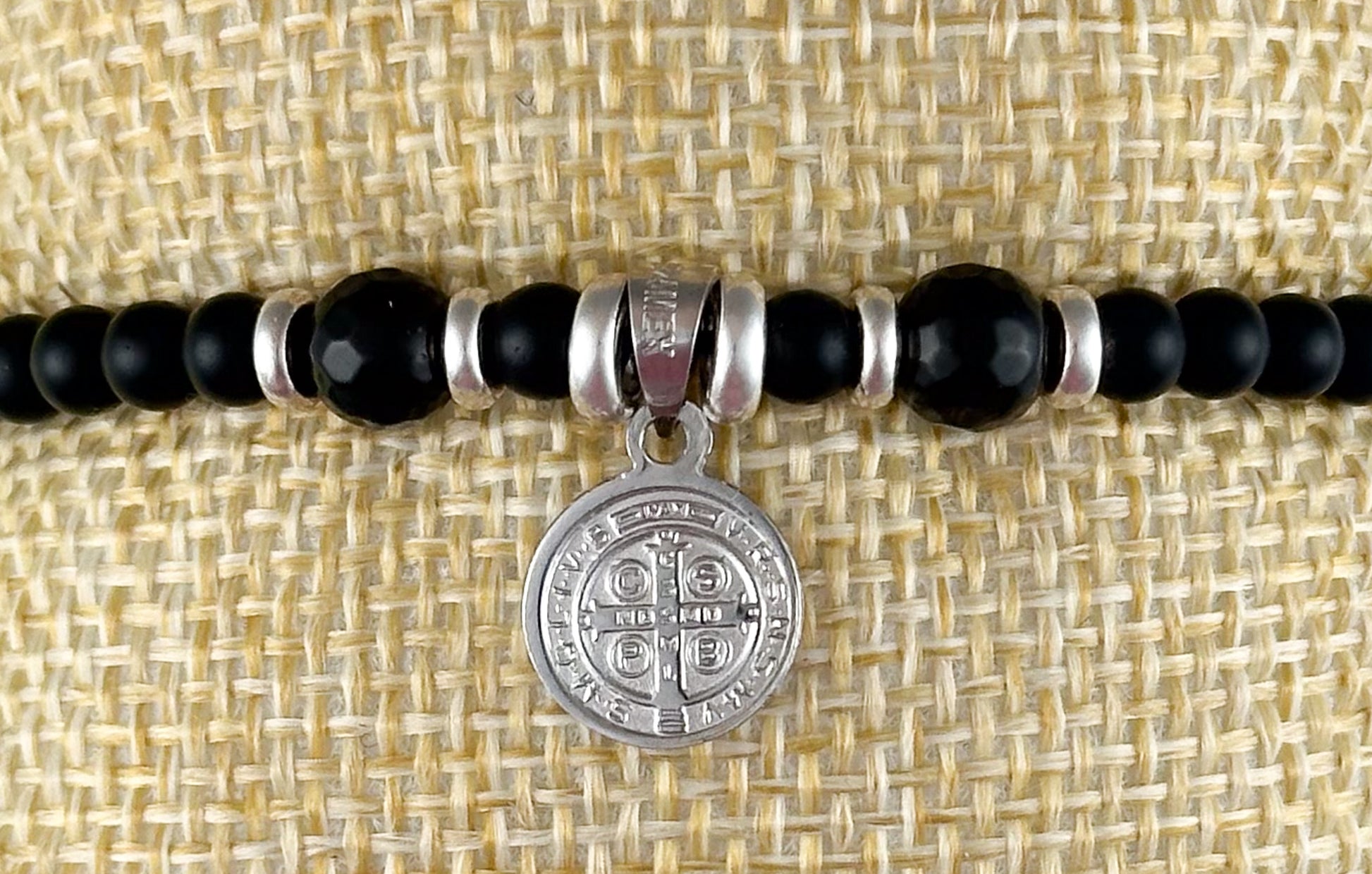 Pulsera tejida a mano con medalla de San Benito con bisel, con donas en plata y piedra natural .