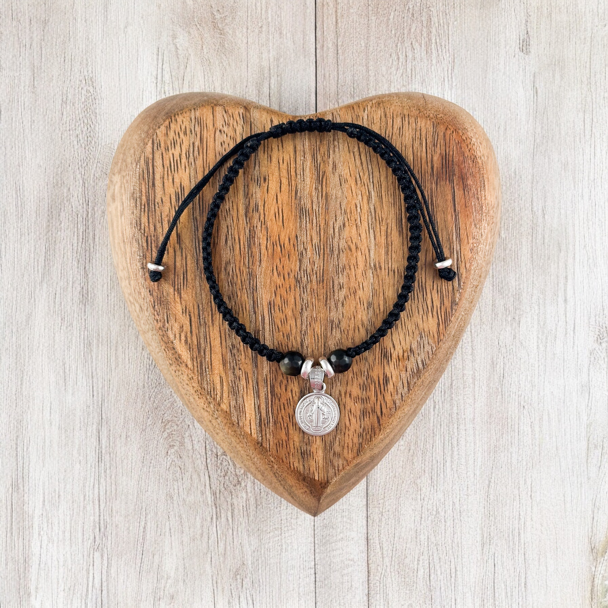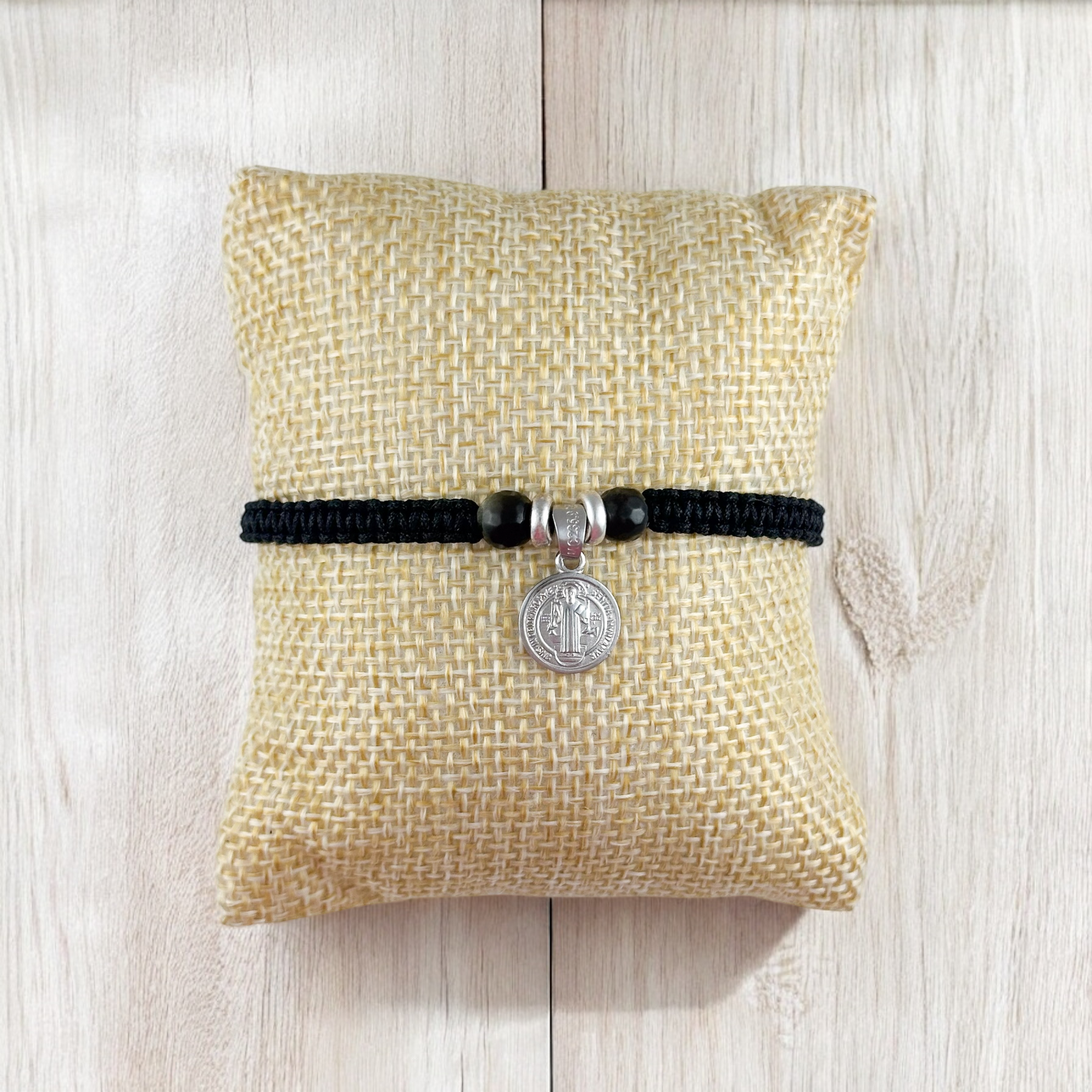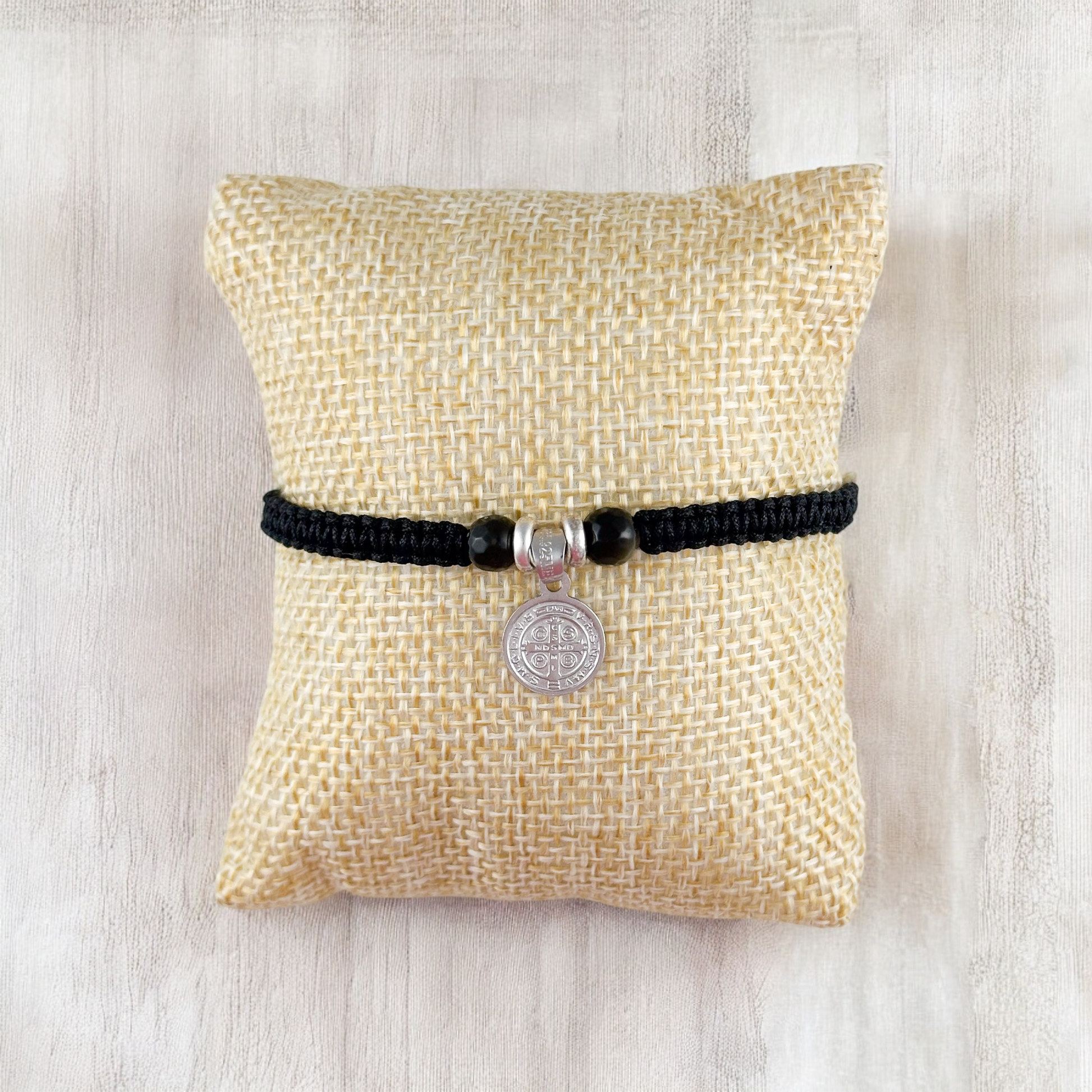 Pulsera tejida a mano con medalla de San Benito con bisel, con donas en plata y piedra natural