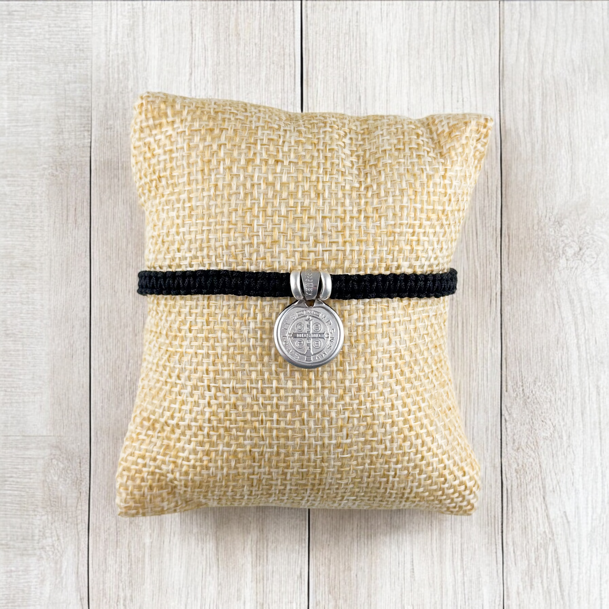 PULSERA MEDALLA SAN BENITO B 2 PLATA .925 TEJIDA NEGRA