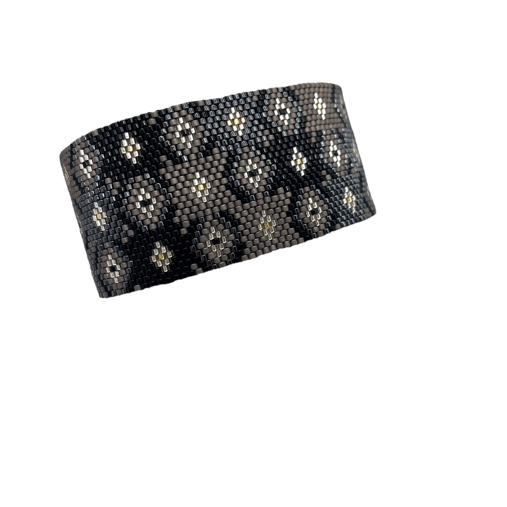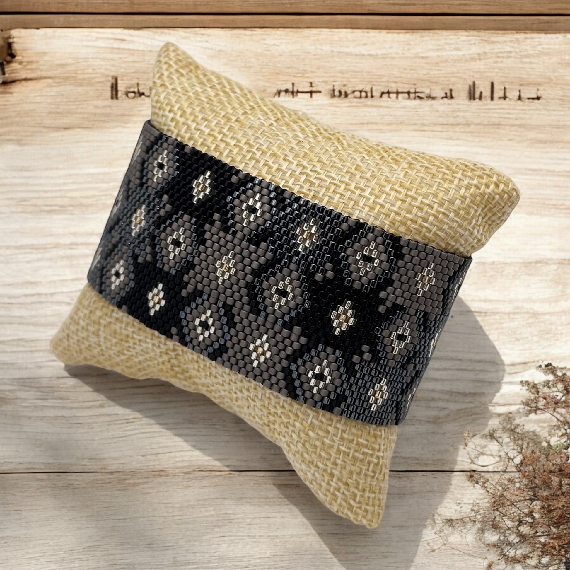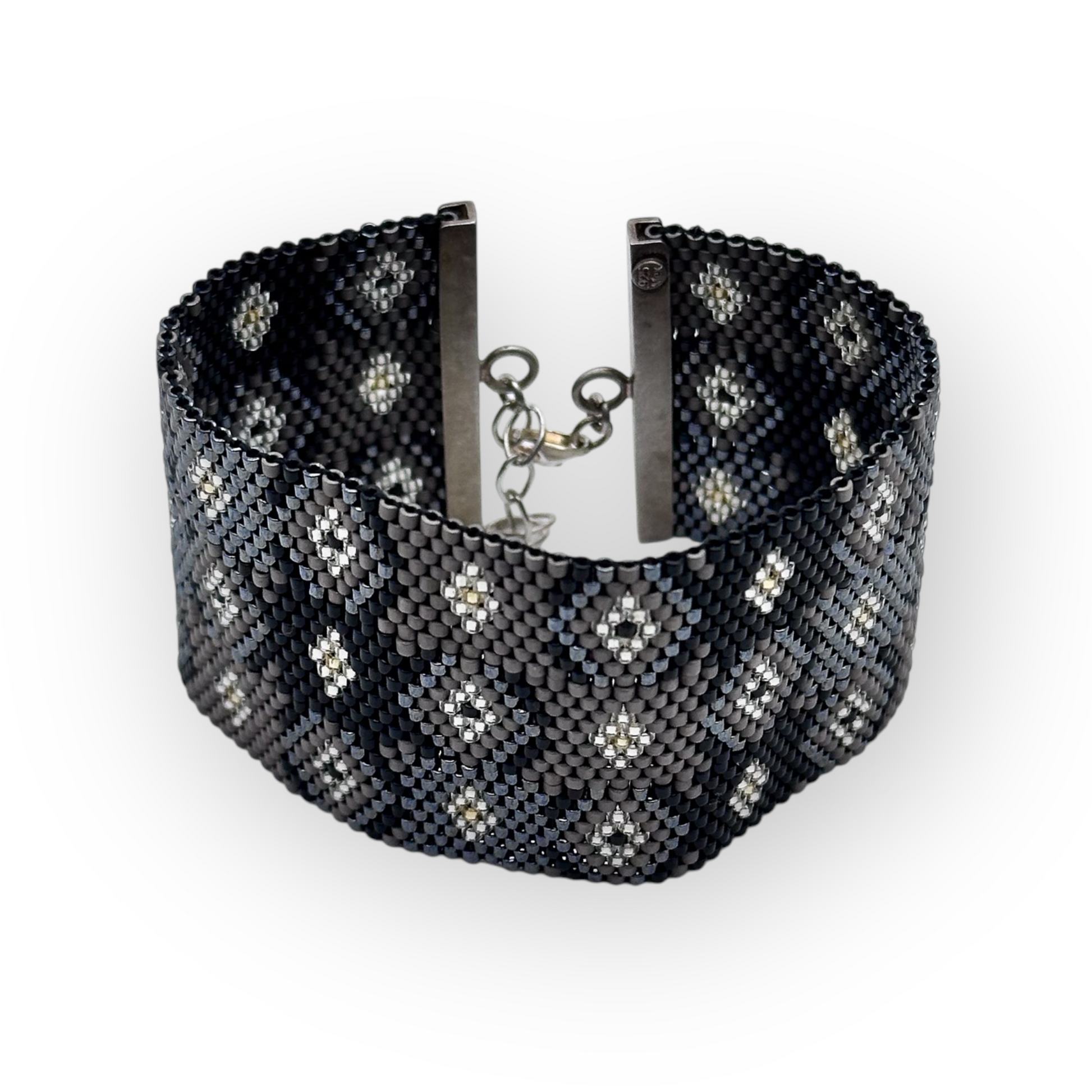 Pulsera tejida huichol chaquira diseño de rombos color negra y gris con broche de plata .925