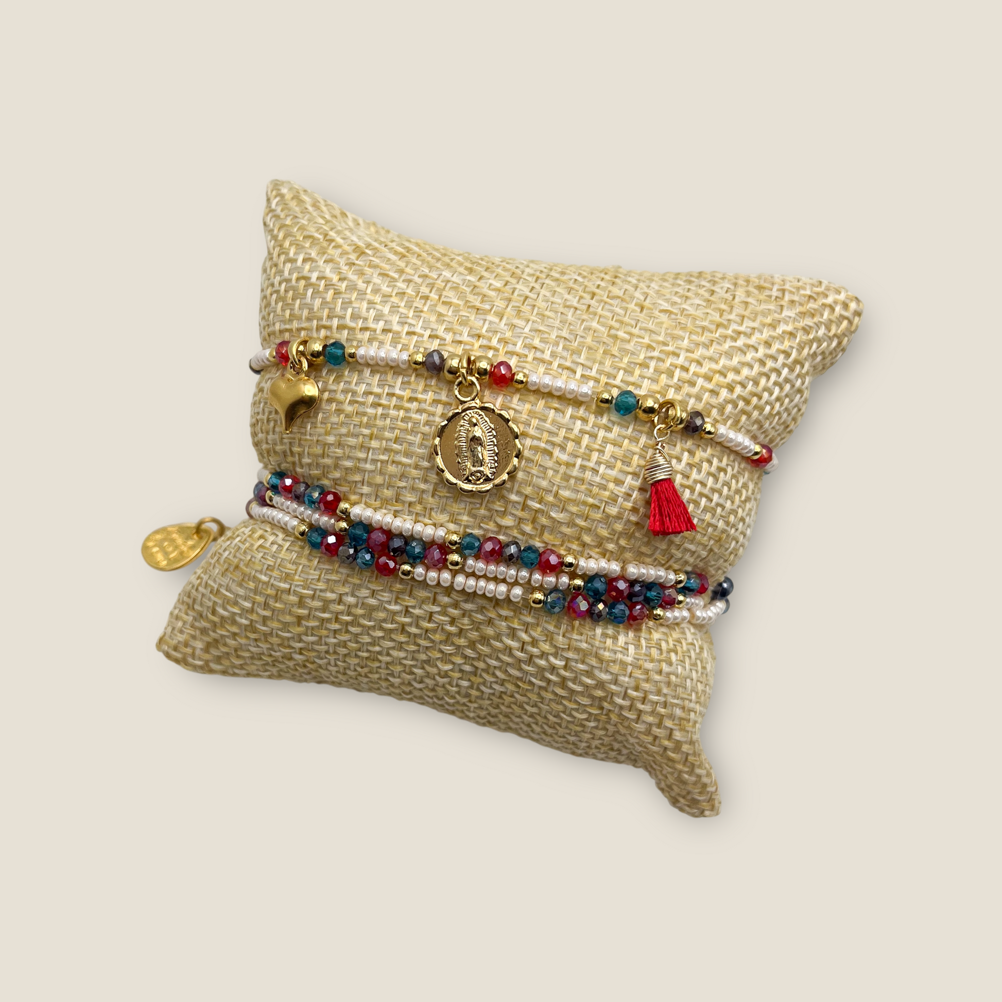 PULSERA CHAQUIRA VIRGEN DE GUADALUPE . Juego dos pulseras . Pulsera engarzada a mano chaquira con medalla de la Virgen de Guadalupe en chapa, con broche de chapa