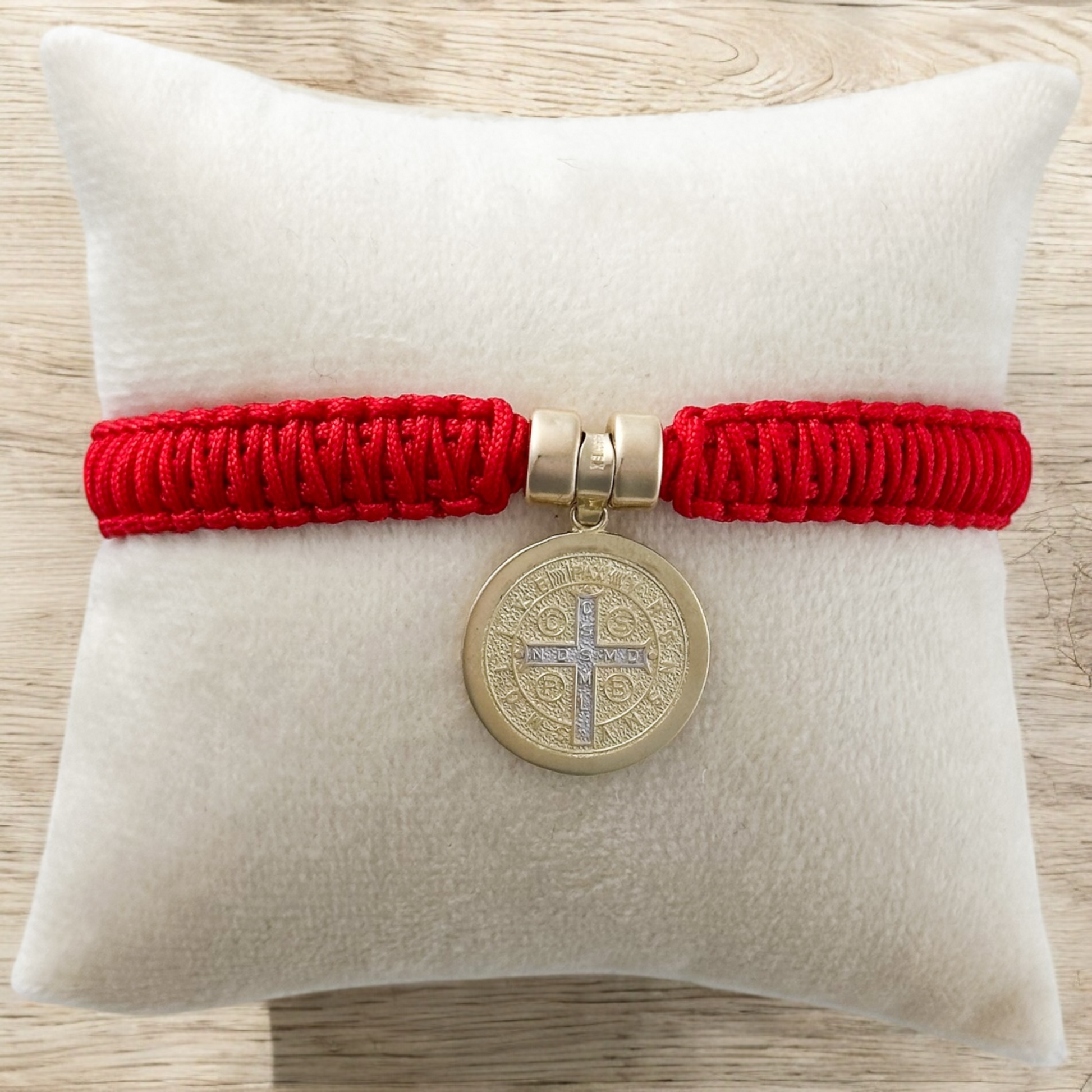 PULSERA MEDALLA SAN BENITO 3 ORO 10K TEJIDA ROJA