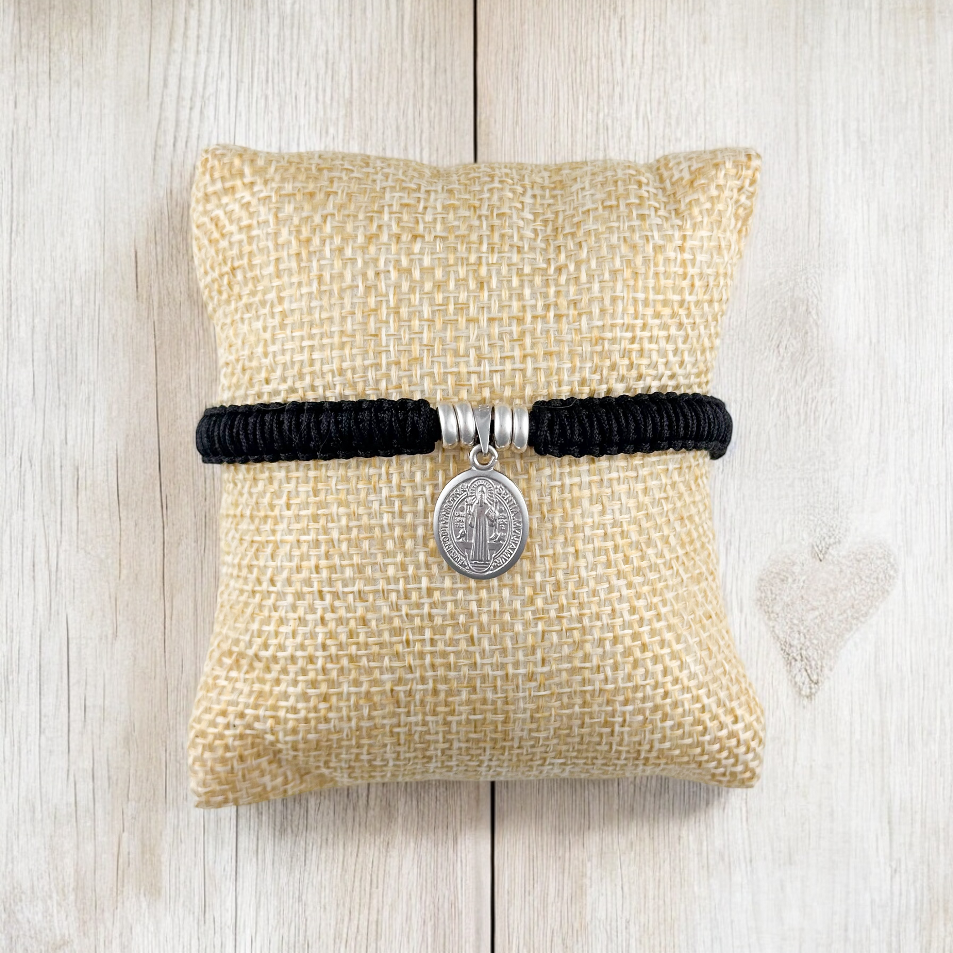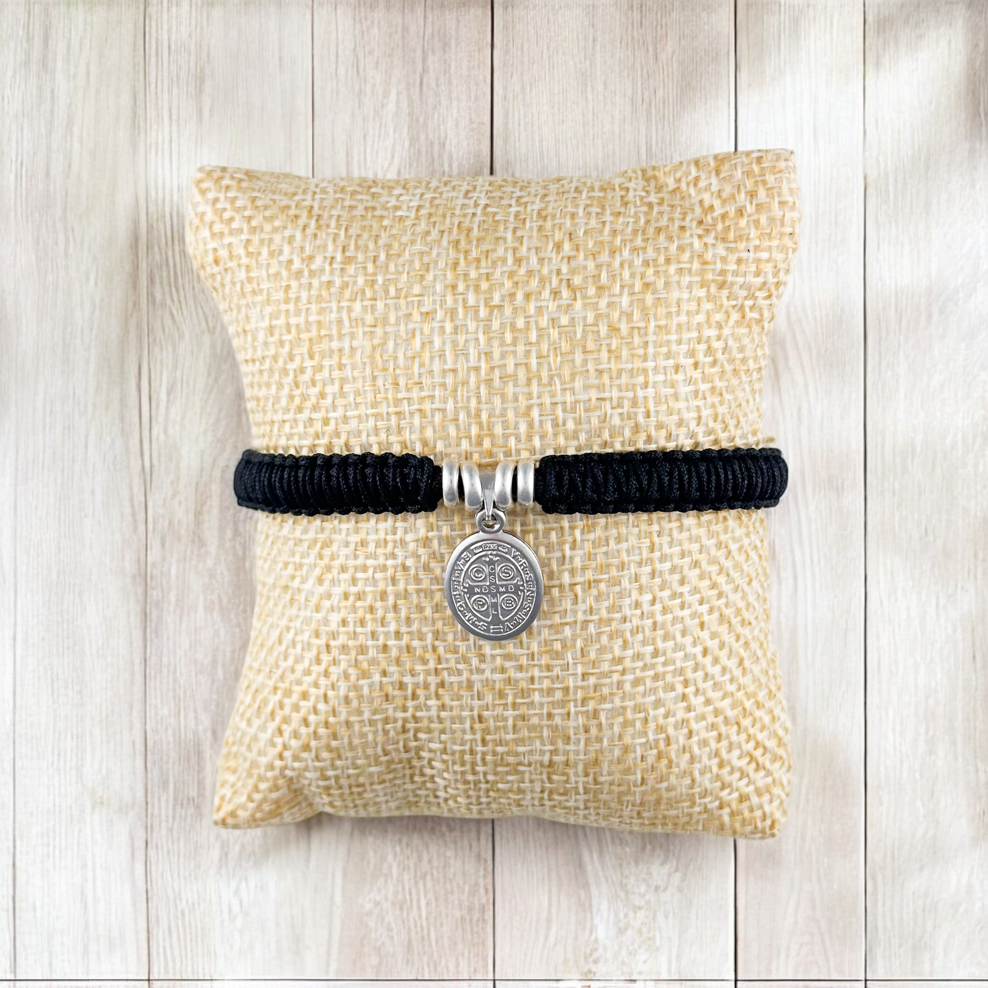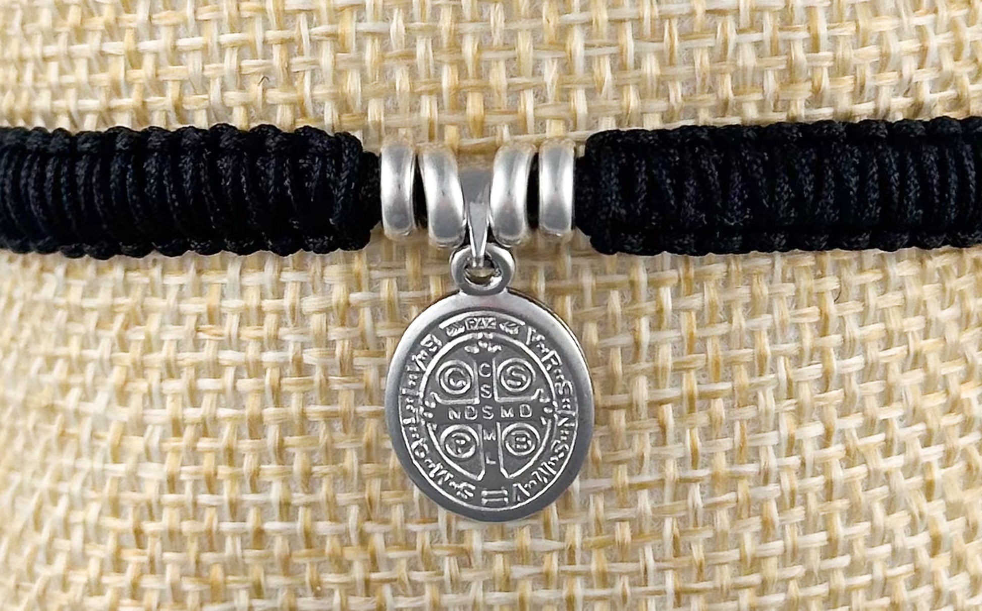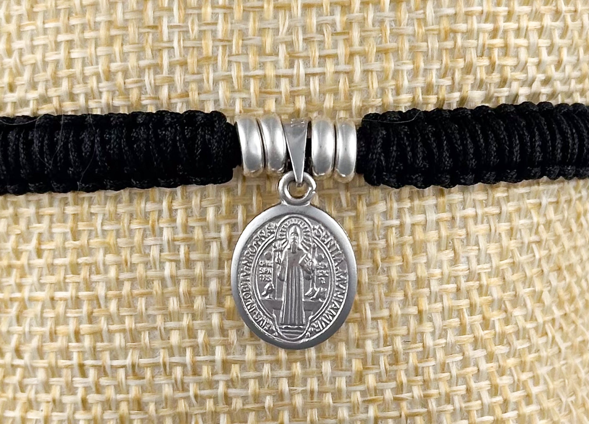 Pulsera tejida a mano con medalla oval de San Benito con bisel, con donas en plata