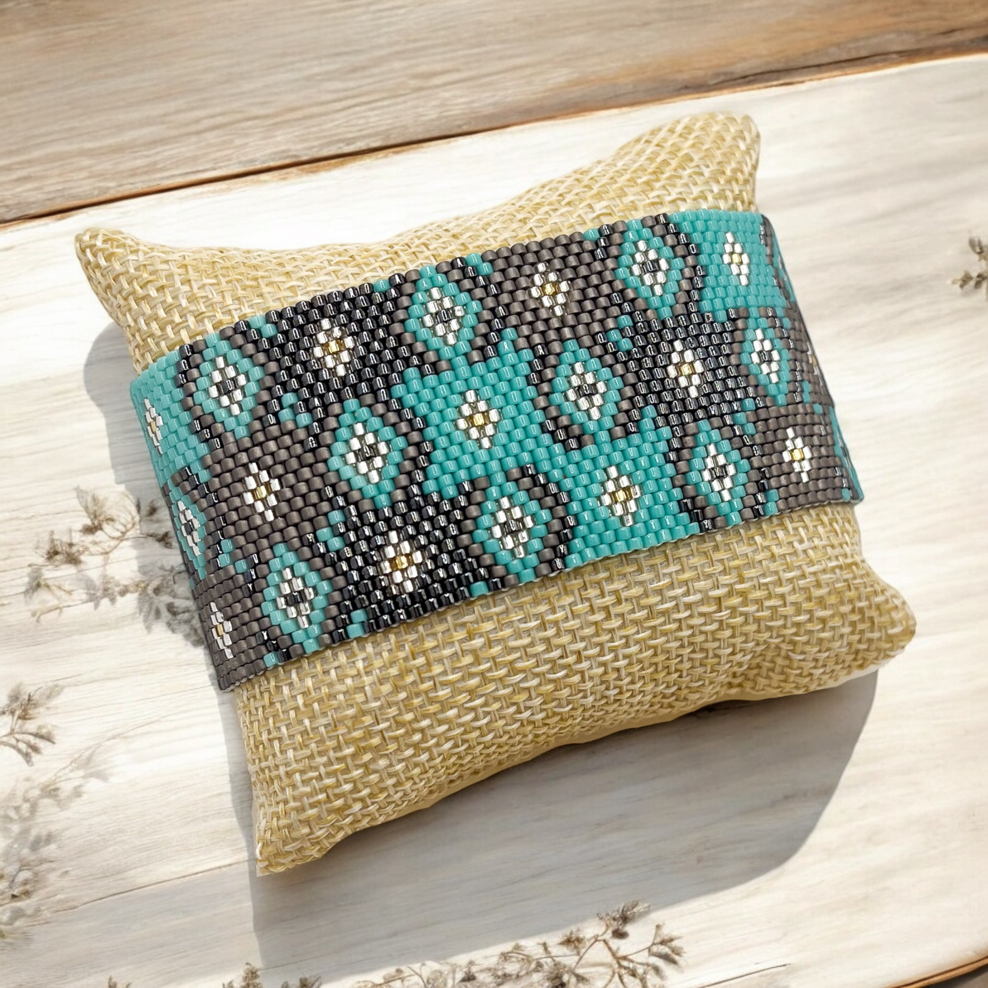 Pulsera tejida huichol chaquira diseño de rombos color turquesa y gris con broche de plata .925