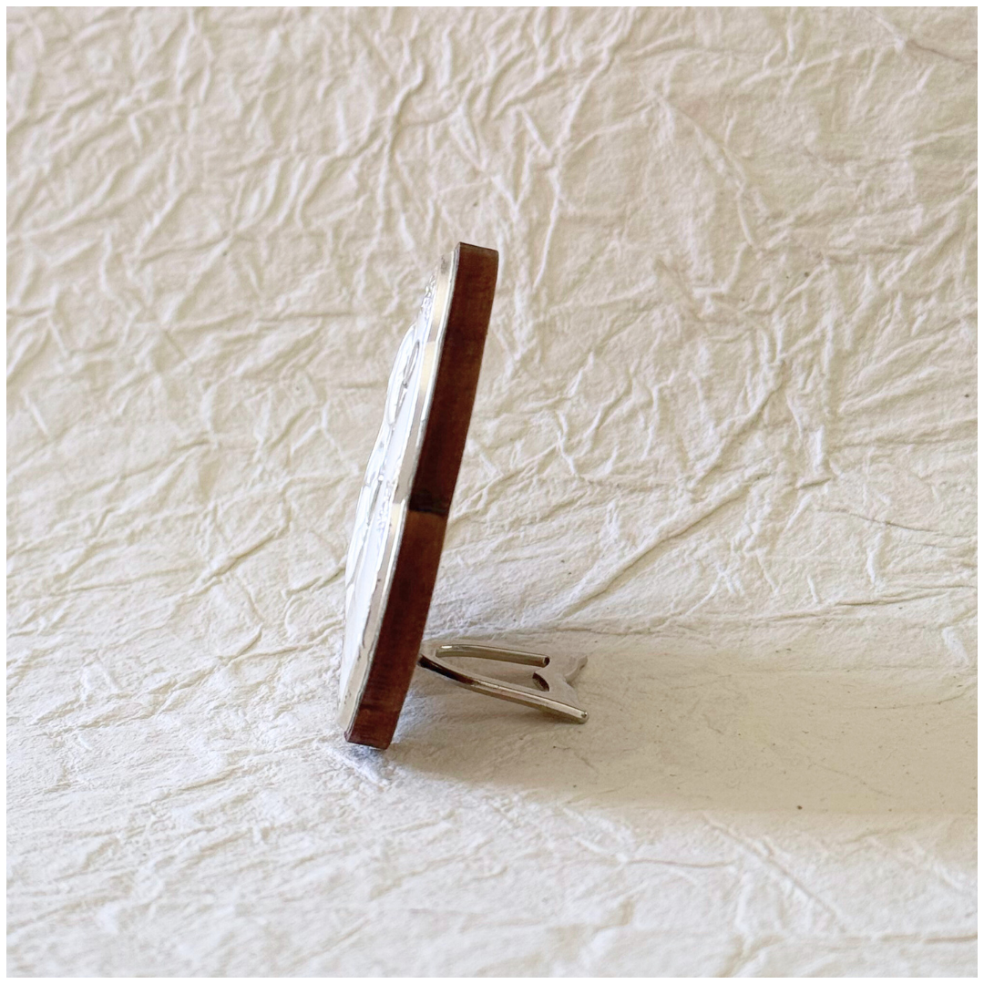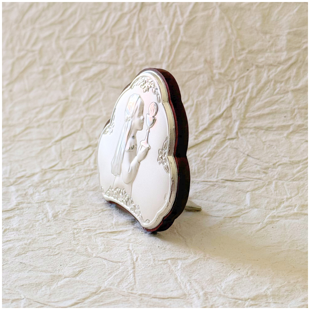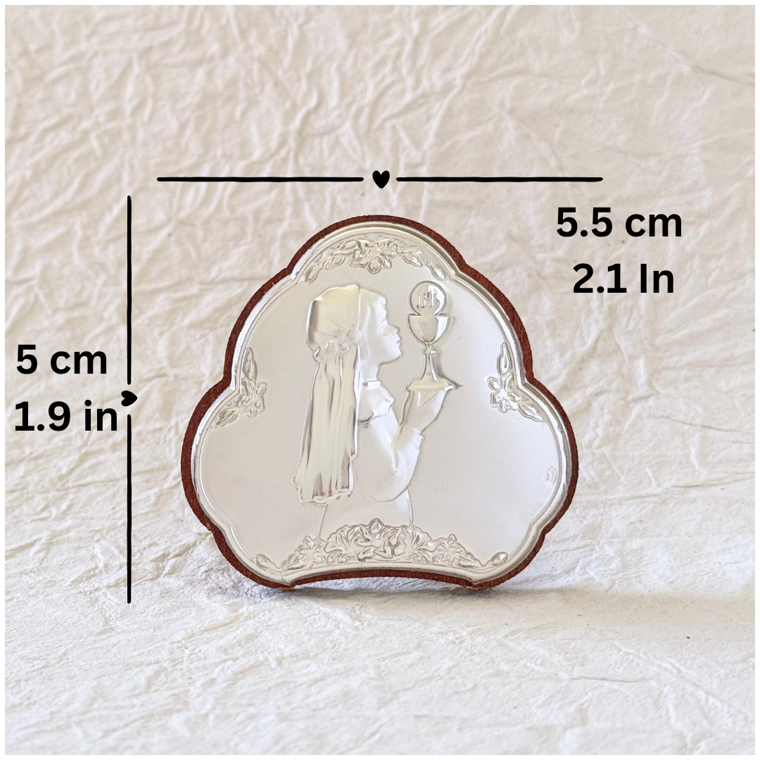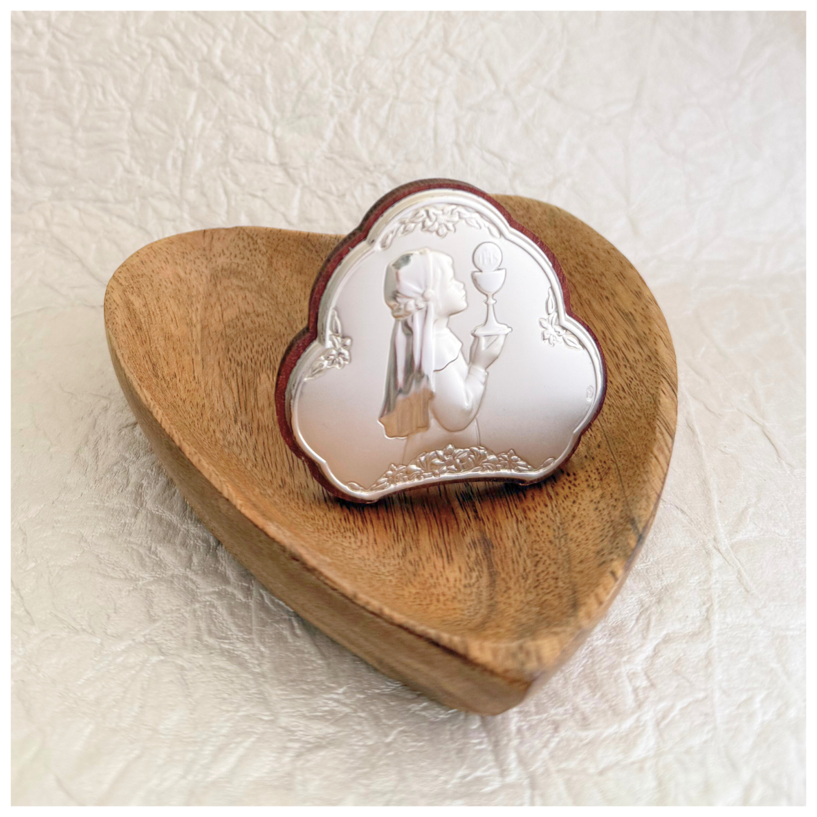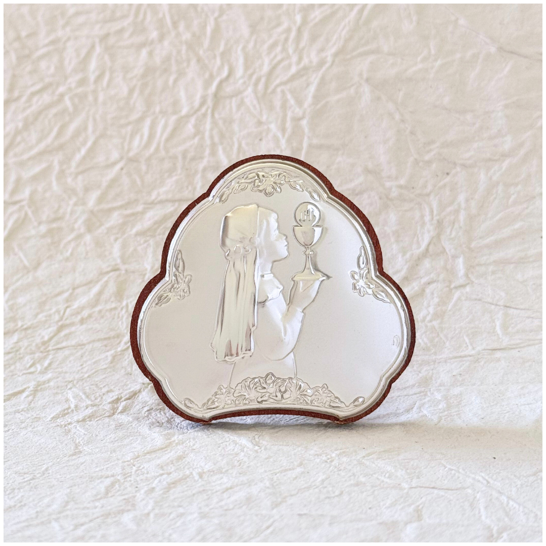 HERMOSO RETABLO NIÑA PRIMERA COMUNION PARA REGALO O RECUERDO DE PRIMERA COMUNION , EN BASE DE MADERA,IMAGEN EN LAMINA TALLADA DE PLATA LEY.925