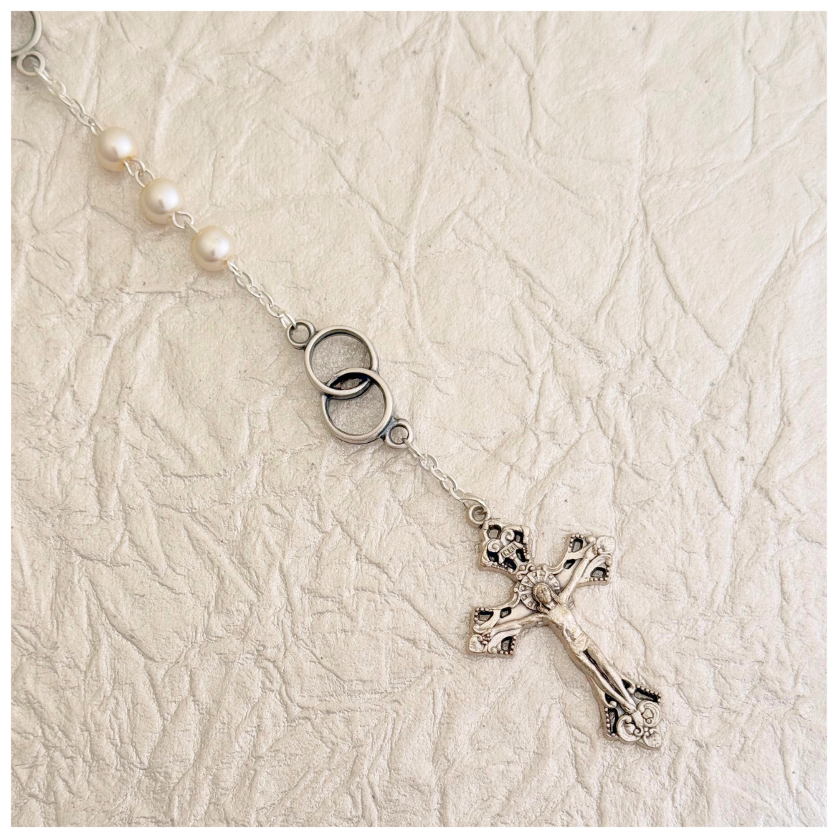 ROSARIO CON PERLA VIRGEN Y CRISTO CON ARGOLLAS DE MATRIMONIO FABRICADO EN MATERIAL ZAMAC ANTIOXIDANTE Y PERLAS 6MM