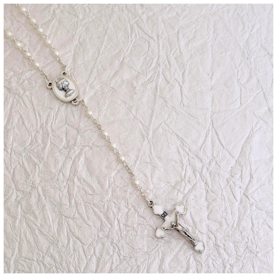 HERMOSO ROSARIO PERLAS CON SU MEDALLA CALIZ PRIMERA COMUNION Y CRISTO ESMALTADO BLANCO CON DORADO
