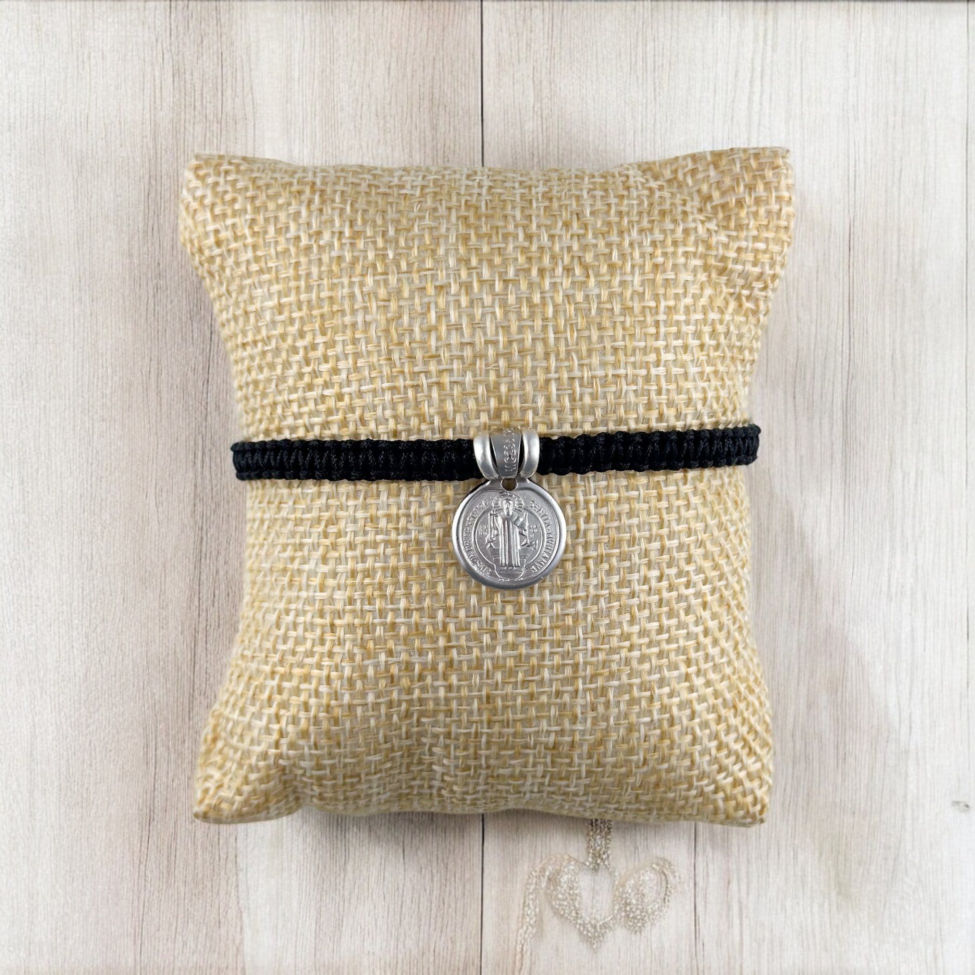 Pulsera tejida a mano con medalla de San Benito con bisel, con donas en plata