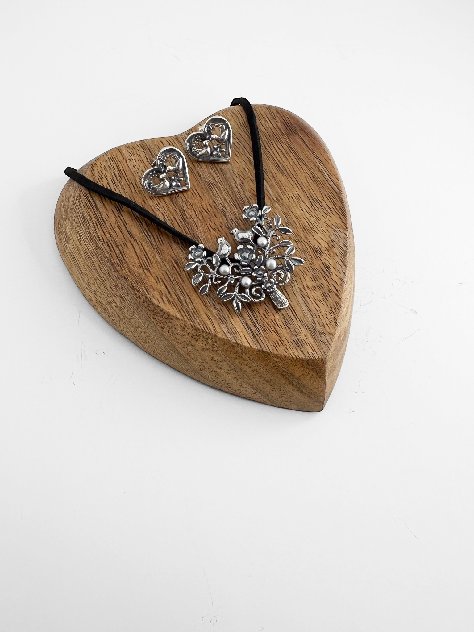 SET ARBOL DE LA AMISTAD DIJE Y ARETE Collar gamuza negra con dije árbol de la amistad con dos pajaritos y perla gris Arete corazón con pajaritos en plata .925 con terminado pavonado