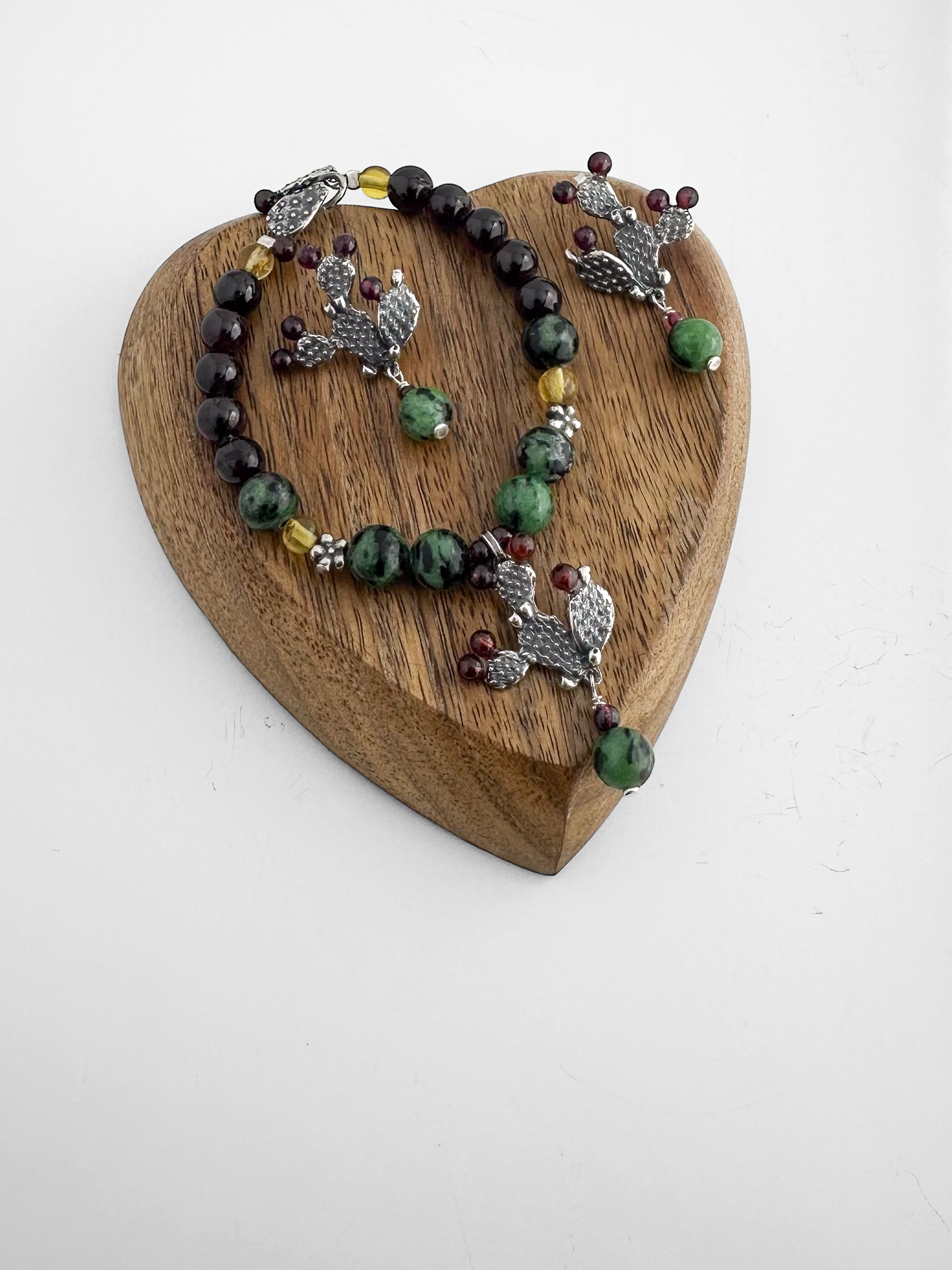 SET NOPAL Pulsera y Arete . Pulsera con piedras naturales ámbar, granate, y matriz de rubí ,con dije colgante de diseño de nopal y broche de nopal en plata .925 con terminado pavonado. Arete nopal con granates .