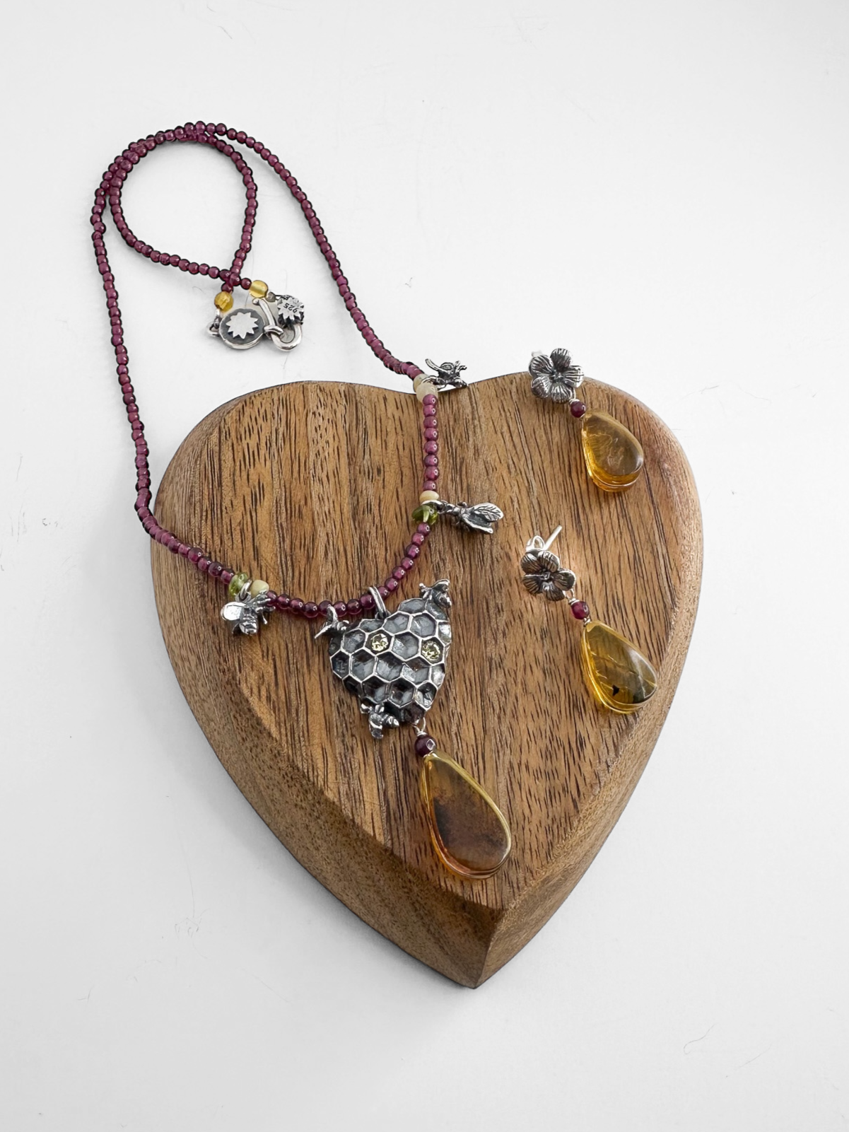SET COLLAR COLMENA Collar y Arete . Collar piedras naturales granate y dijes de abejas y corazón colmena en plata .925 con piedra ámbar colgante . Arete flor en plata piedra ámbar colgante