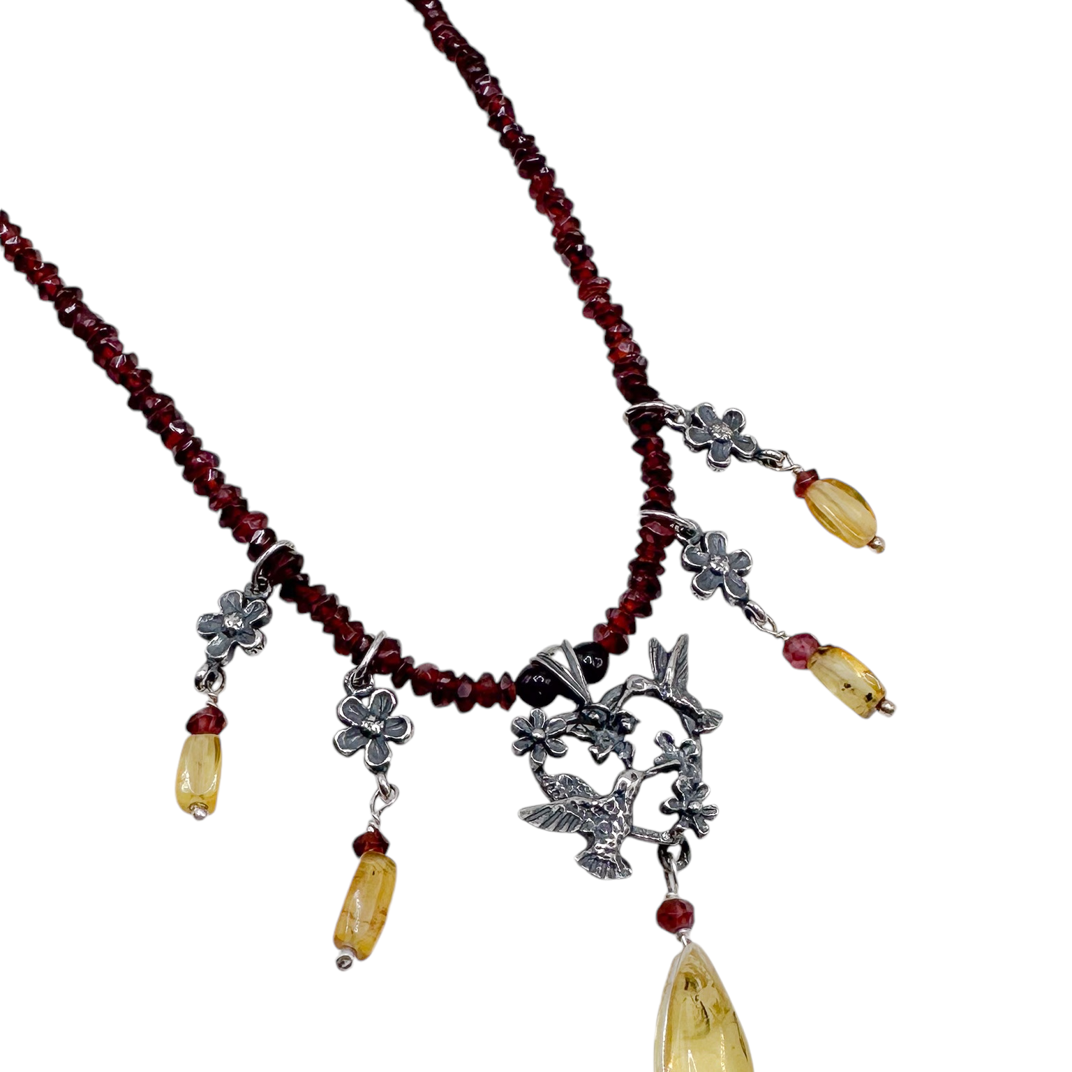 SET CORAZON COLIBRI. Collar y Arete . Collar en piedra natural granate con dije de corazón colibríes enamorados y flores con colgantes de piedra ámbar .Arete CORAZON COLIBRI en plata .925 con piedra ámbar colgante